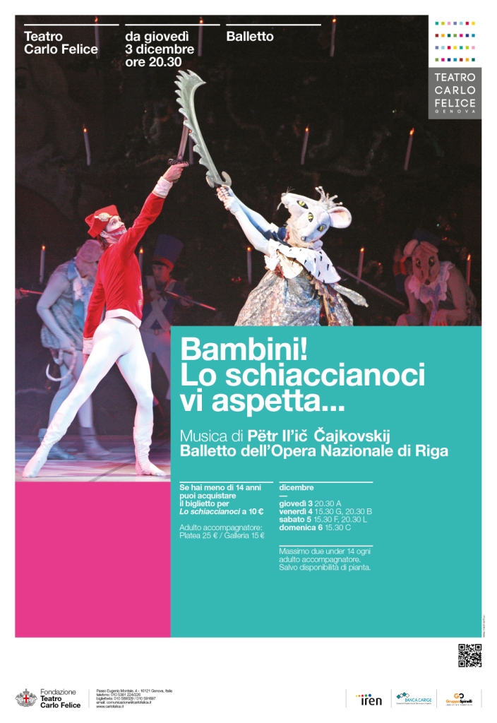 Dicembre 3-4-5-6, 8.30 pm, Carlo Felice's Theatre: The Nutcracker. Music by Pëtr Il'ič Čajkovskij; coreography by Aivars Leimanis; Riga Mational Opera Ballet. Orchestra Conductor: Farhads Stade.