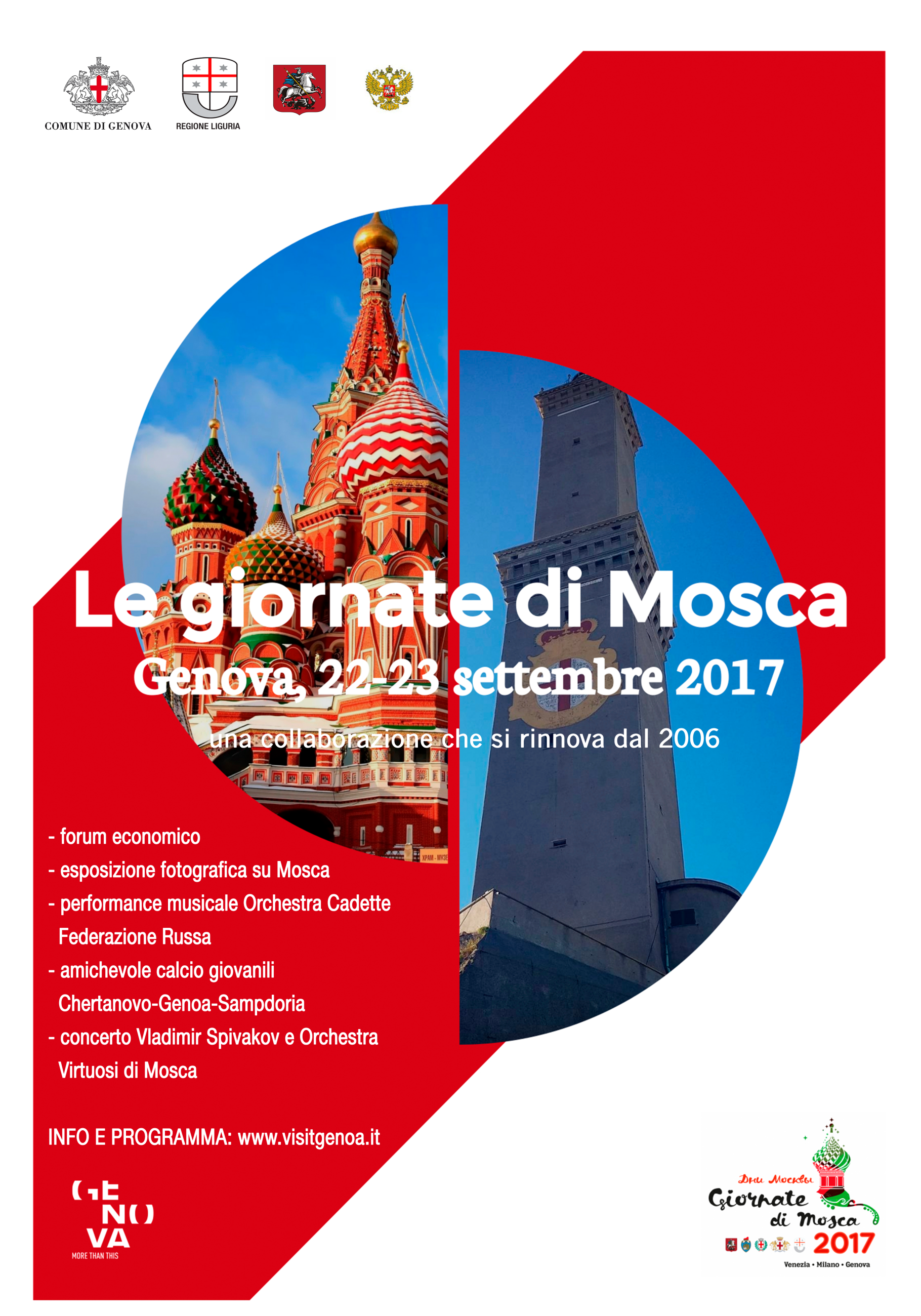 The event, organized by Comune di Genova, thanks to a special cooperation agreement with Moscow, will be composed by different moments and meetings, through music, economy, sport and photography. Many activities are planned: a forum on economical thematics at Palazzo Ducale, a friendly match between the youth football clubs Chertanovo-Genoa-Sampdoria, a photographic exhibition about Mosca in Piazza Matteotti.