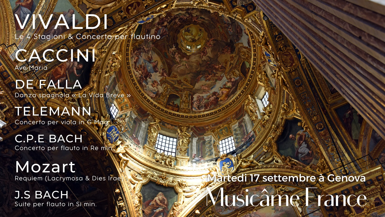 Biglietti: possono essere acquistati online al seguente link: https://musicamefrance.com/concert/prossimamente-a-genova-le-4-stagione-de-vivaldi-ave-maria-de-caccini-requiem-de-mozart-bach-de-falla-albinoni/.