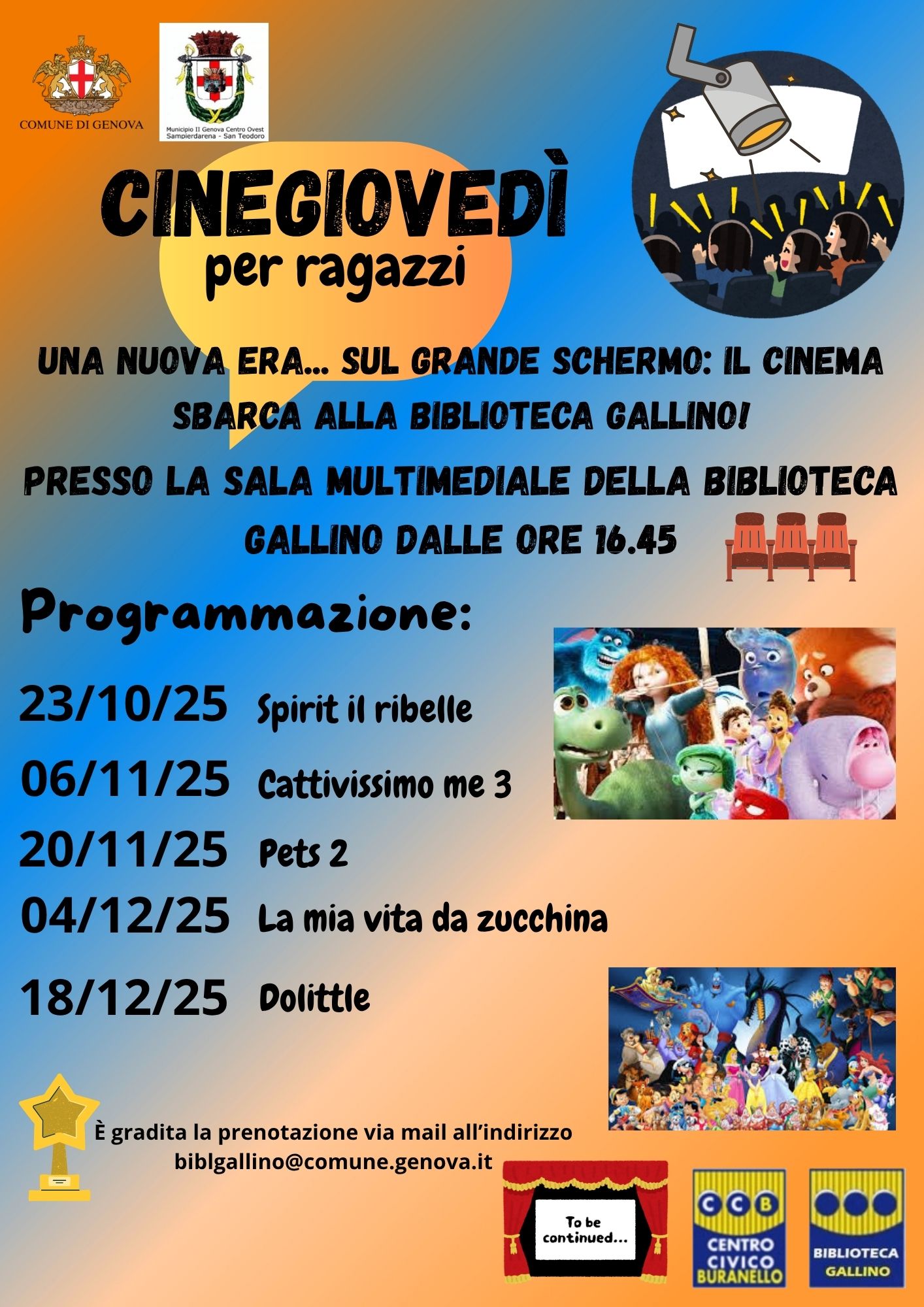 Cineforum aperto al pubblico con spettacoli dedicati ai ragazzi a giovedì alternati, si tiene nella sala Multimediale della Biblioteca Gallino, Un bellissimo progetto per condividere la gioia di vedere tutti insieme i cartoni sul grande schermo, per poi discuterne.