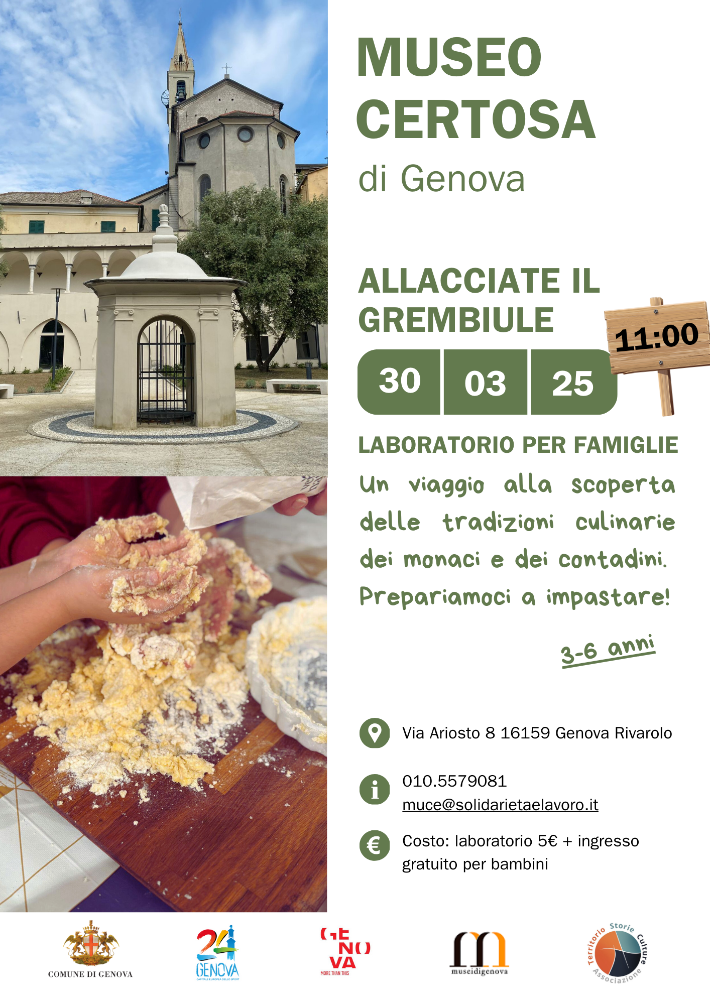 Il MUCE-Museo Certosa di Genova invita i bambini e le bambine dai 3 ai 6 anni a partecipare al laboratorio ludico-didattico “Allacciate il grembiule”, alla scoperta dei profumi e dei sapori di un tempo.