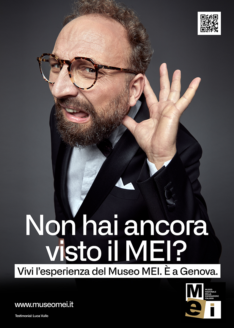 Il testimonial di questa campagna è Luca Vullo, ambasciatore della gestualità italiana del mondo, che ha trasformato ciò che spesso viene visto come uno stereotipo folcloristico in un patrimonio immateriale della nostra cultura, che può essere studiato. Da diversi anni Vullo è anche ospite di Ambasciate, Consolati, Istituti Italiani di Cultura e teatri all’estero con il suo show “La voce del corpo” dove analizza, con ironia e approfondimento socioculturale, le differenze tra la gestualità italiana e quella degli altri Paesi. Collabora inoltre con Rai1 dove ogni domenica, racconta con la gestualità le arie d'opera che hanno reso l'Italia famosa nel mondo. Vullo, che è stato un emigrato a Londra per quasi dieci anni, con i suoi progetti, promuove le eccellenze “made in Italy”, incontrando spesso le tante comunità all’estero. Ecco perché il MEI ha deciso di realizzare proprio con lui una campagna promozionale originale. Lo spettatore, attraverso lo straordinario linguaggio del corpo tipico degli italiani, durante il video è invitato a visitare il Museo e il testimonial comunica e fornisce tutte le informazioni usando esclusivamente i gesti delle mani e le espressioni del viso, che sono supportate dai sottotitoli in diverse lingue (italiano, inglese, francese, portoghese e tedesco).