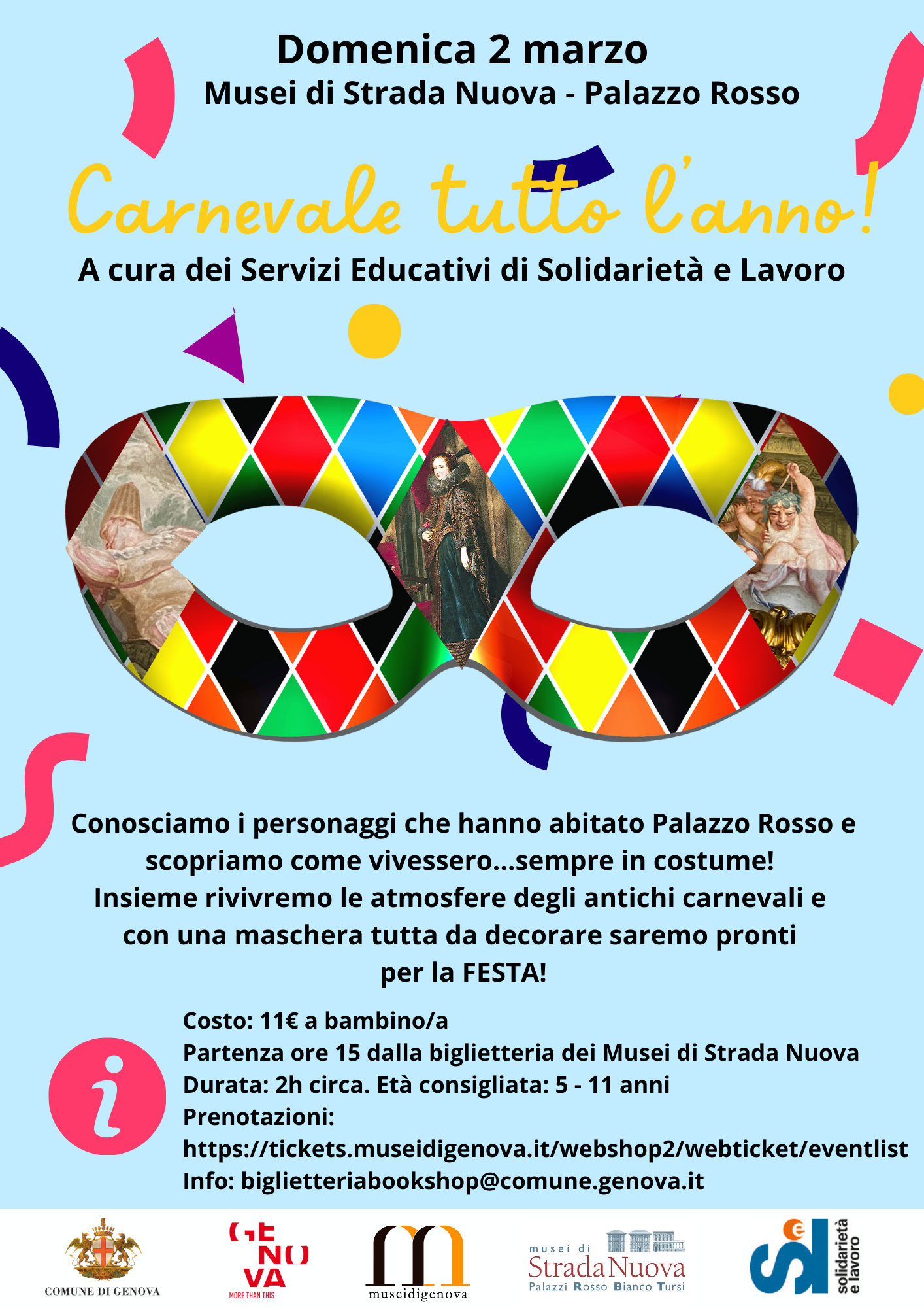In occasione del Carnevale, domenica 2 marzo alle ore 15:00 i Musei di Strada Nuova propongono “Carnevale tutto l’anno!”, una speciale attività per bambini a Palazzo Rosso, a cura dei Servizi Educativi di Solidarietà e Lavoro. L’attività comprende un momento di visita e scoperta del Museo, e una sessione laboratoriale in cui i piccoli partecipanti potranno dare libero sfogo alla propria creatività.