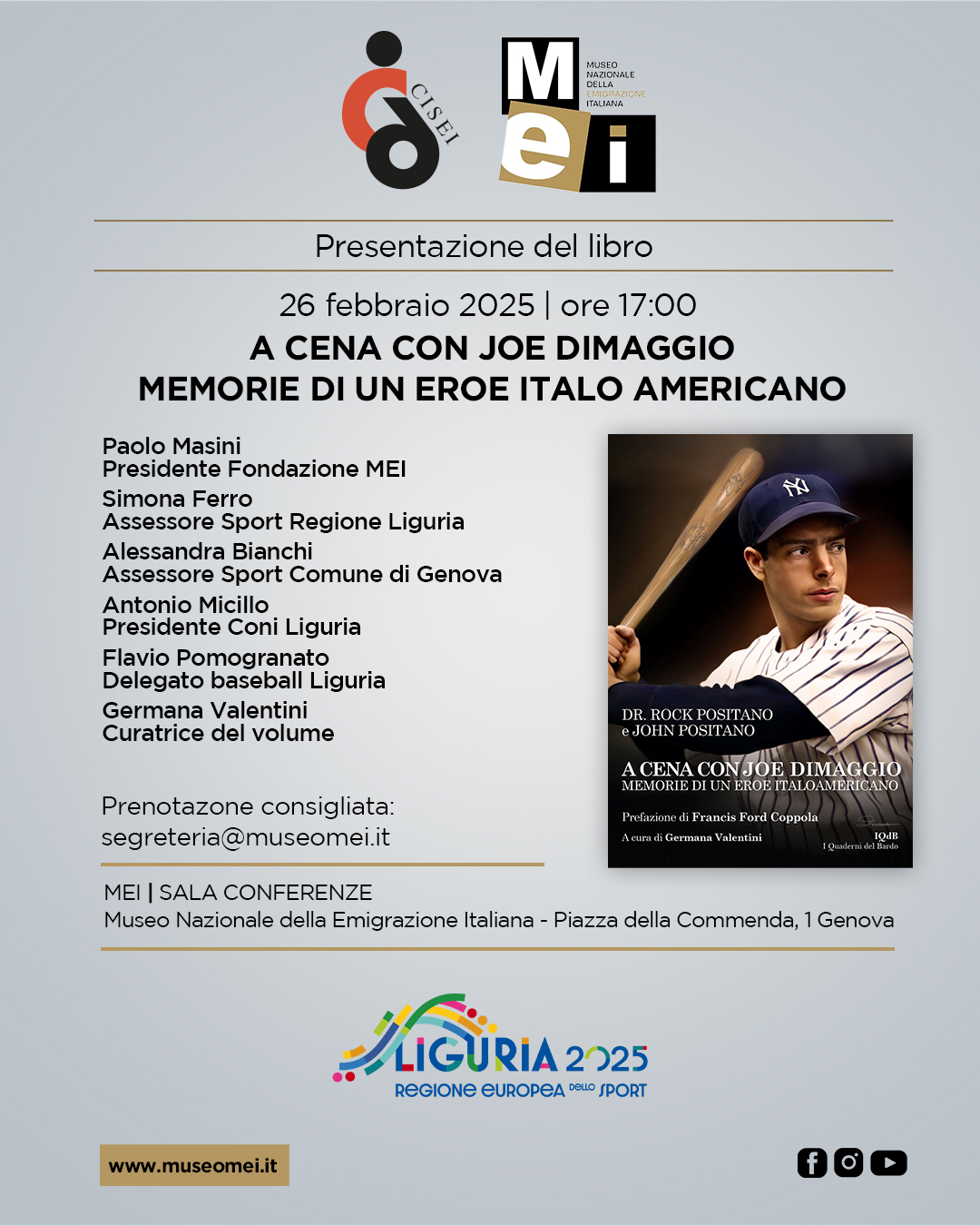Per “I mercoledì al MEI”, presentazione del libro (la prima in assoluto in Liguria) “A cena con Joe DiMaggio – Memorie di un eroe italo americano” del Dott. Rock Positano e John Positano, i Quaderni del Bardo Edizioni di Stefano Donno, 2024. Il best seller “Dinner with DiMaggio” con prefazione di Francis Ford Coppola, curato da Germana Valentini e tradotto da Giovanna Ciracì. Il volume ospita un omaggio inedito a Joe DiMaggio ad opera dell’artista Paola Scialpi. Oltre al famoso regista americano, nel testo ricordano DiMaggio anche Lidia Bastianich, Fay T. Vincent e Paolo Masini (Presidente Fondazione Museo Nazionale dell’Emigrazione Italiana).