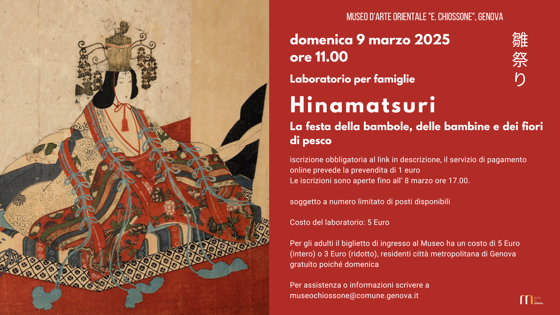 Anche quest’anno il Museo d'Arte Orientale Chiossone - Genova dedica un’attività alla festa tradizionale giapponese di Hinamatsuri, una ricorrenza dedicata alle bambine, alle bambole e ai fiori di pesco. E' possibile conoscere le tradizionali bambole hina e l’altare a gradoni rossi (hinadan) su cui vengono allestite. Si parla di fiori di pesco, della loro simbologia, dell’arrivo della primavera e delle sue tradizioni che ancora oggi si tramandano in Giappone.