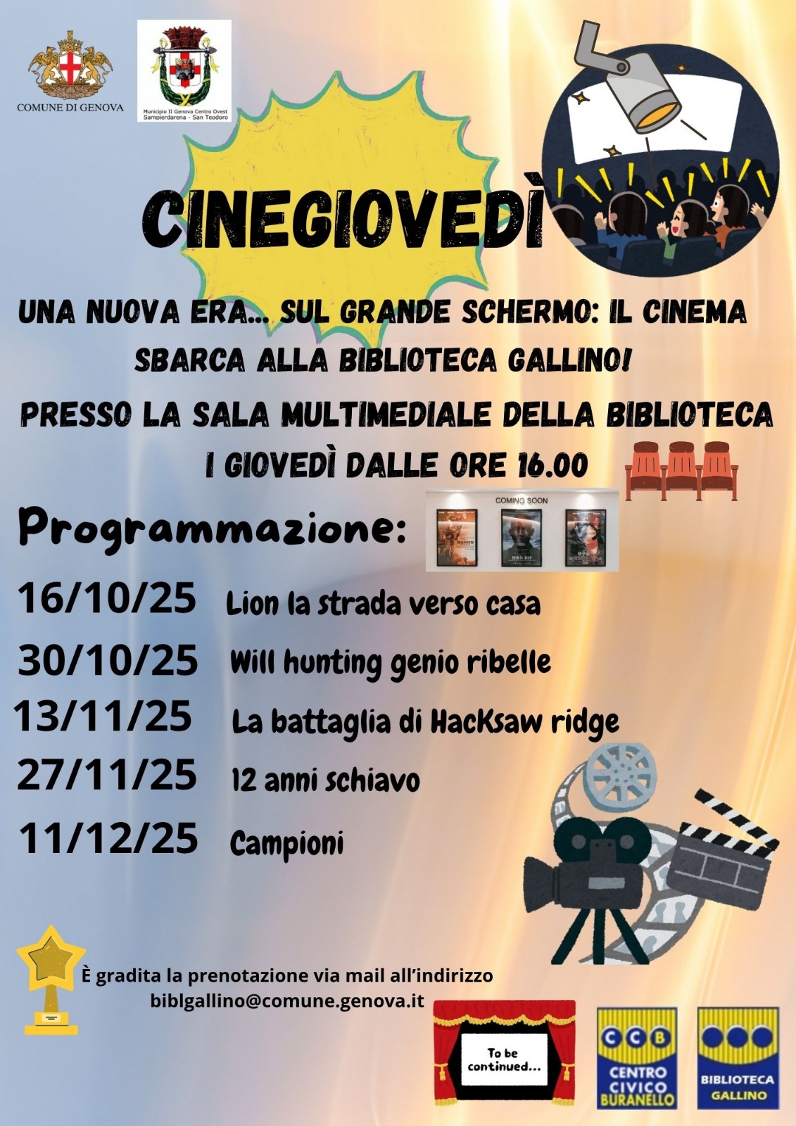 Cineforum aperto al pubblico con spettacoli dedicati agli adulti a giovedì alternati, si tiene nella sala Multimediale della Biblioteca Gallino, Un bellissimo progetto per condividere la gioia di vedere tutti insieme film sul grande schermo, per poi discuterne.