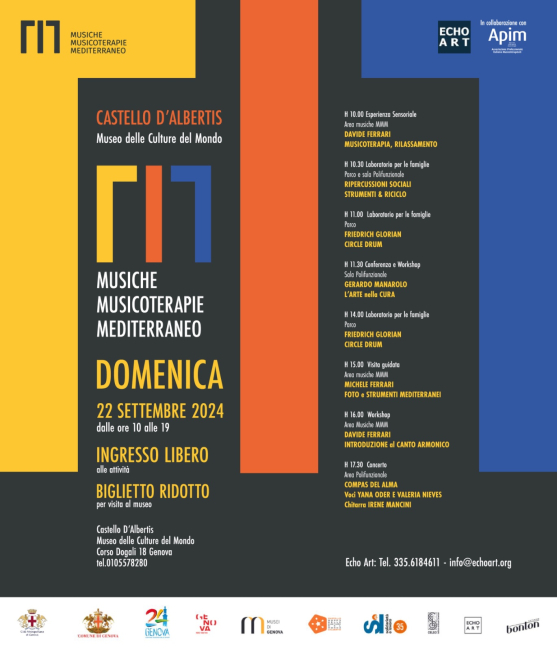 Gli incontri sono a partecipazione libera, organizzati da Echo Art con il sostegno della Città Metropolitana di Genova, con laboratori di musica e musicoterapia, costruzione strumenti, musica d'insieme, conferenza, visita guidata alla nuova esposizione di strumenti e fotografie e concerto finale.