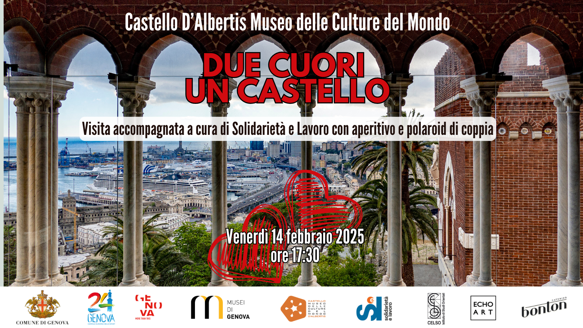 La Festa di San Valentino in una location unica al tramonto, con visita, aperitivo e foto ricordo. In occasione della giornata più romantica dell’anno, i Servizi Educativi della Cooperativa Solidarietà e Lavoro offrono una speciale visita a porte chiuse di Castello D’Albertis Museo delle Culture del Mondo, location unica e suggestiva, dove gli innamorati possono trascorrere la Festa di San Valentino e godere della vista del tramonto sulla città e il porto, affacciati dalle terrazze panoramiche del castello.