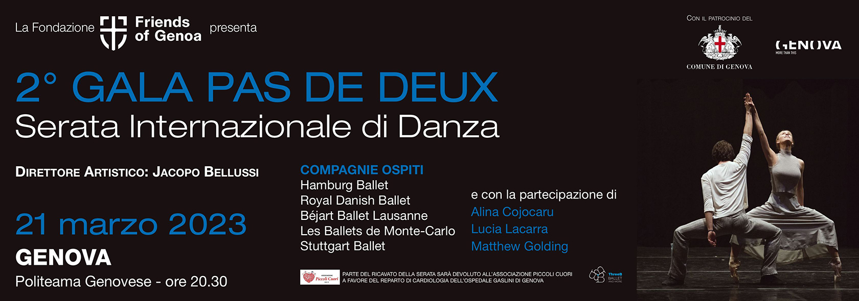 La grande danza internazionale torna a Genova, con due serate di straordinaria bellezza fortemente volute da Jacopo Bellussi, etoile di Hamburg Ballet, che nella duplice veste di ballerino e di direttore artistico ha riunito alcuni tra i principali primi ballerini e solisti delle maggiori compagnie europee per rendere omaggio alla sua città e, soprattutto, per dare un concreto contributo all’ospedale Gaslini. Anche quest’anno, infatti, parte del ricavato delle serate verrà devoluto all’Associazione Piccoli Cuori OdV, che sostiene i reparti di cardiologia e cardiochirurgia dell’ospedale Gaslini di Genova.