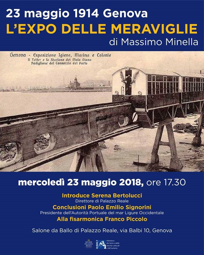 Mercoledì 23 maggio 2018, nel Salone da Ballo del Palazzo Reale alle ore 17.30, "23 maggio 1914 Genova. L'Expo delle meraviglie" di Massimo Minella.Introduce Serena Bertolucci, direttore di Palazzo RealeConclusioni di Paolo Emilio Signorini, Presidente dell'Autorità Portuale del Mar Ligure OccidentaleAlla fisarmonica Franco Piccolo