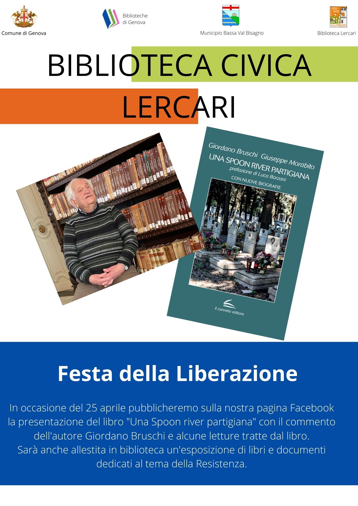 Un grande personaggio della storia del Novecento genovese alla biblioteca Lercari! Giordano Bruschi si racconta con la sua diretta testimonianza e con i suoi libri, una memoria sempre viva e al servizio della comunità con l'intento di trasmettere alle giovani generazioni gli ideali della Resistenza. L'incontro con Giordano Bruschi che presenta il suo libro "Una Spoon River partigiana" è completato da un'esposizione bibliografica allestita in biblioteca dal 23/4 al 7/5 e visitabile solo negli orari di apertura della biblioteca.