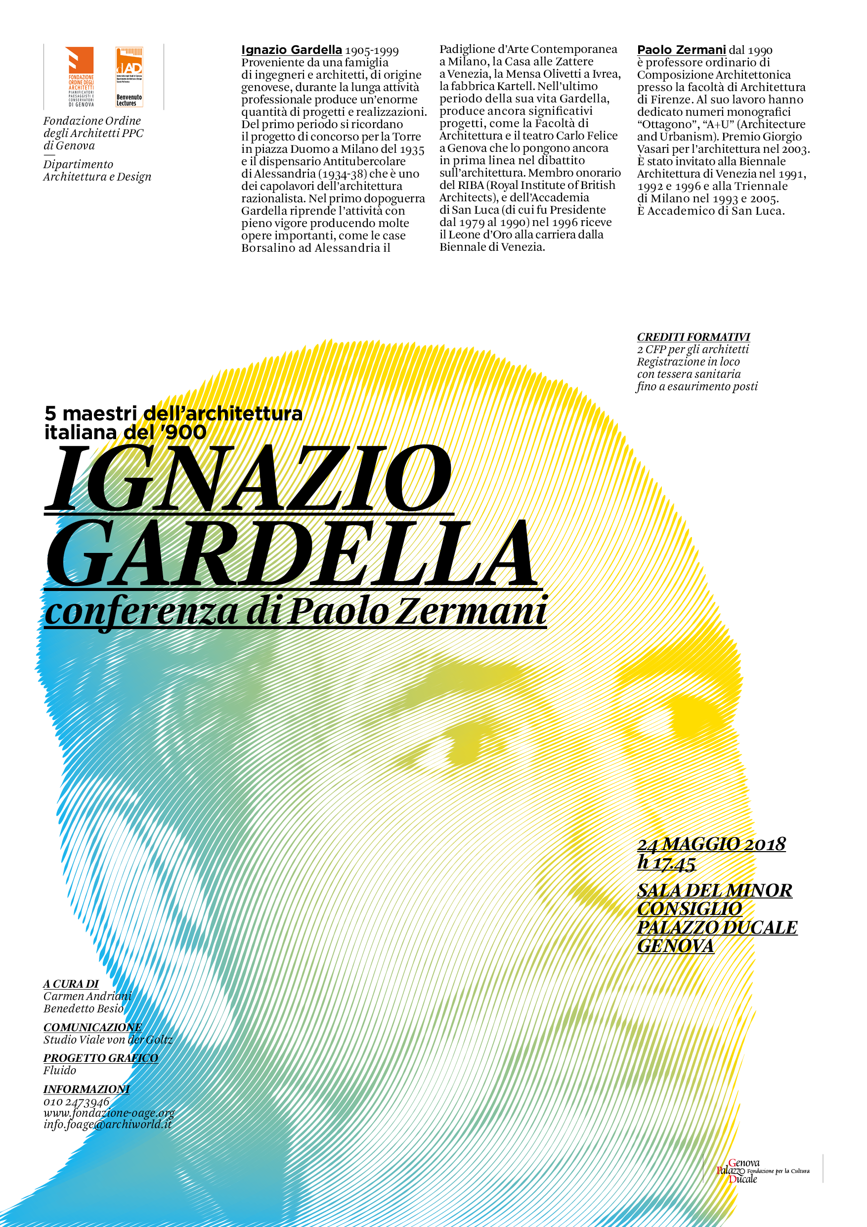 Il 24 maggio alle ore 17.45 nella Sala del Minor Consiglio a Palazzo Ducale inizia il ciclo di 5 incontri sui maestri dell'architettura italiana del '900. Apre Paolo Zermani, professore ordinario di Composizione Architettonica presso la facoltà di Architettura di Firenze, raccontando di Ignazio Gardella (1905- 1999). Quest'ultimo, di origine genovese, produce il dispensario Antitubercolare di Alessandria (1934-1938), uno dei capolavori dell'archiettura razionalista.L'ingresso è libero a esaurimento posti.Di seguito altri appuntamenti della rassegna.