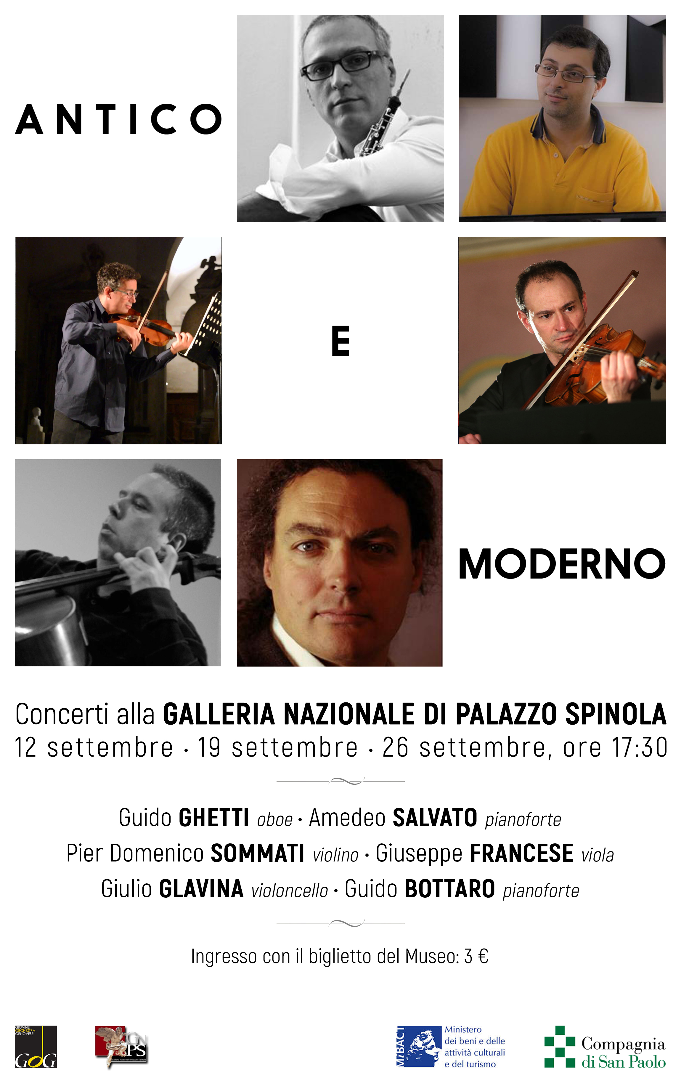 Torna, nel magnifico salone del secondo piano nobile della Galleria Nazionale di Palazzo Spinola, la serie di concerti intitolata "Antico e Moderno". Nel corso del mese di settembre si susseguiranno tre appuntamenti con programmi che alternano composizioni antiche o classiche ad altre novecentesche, accompagnate da una presentazione utile al pubblico per inquadrare storicamente i brani che verranno eseguiti.