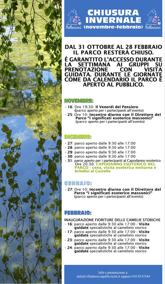 Nonostante la chiusura invernale dello splendido parco di Villa Durazzo Pallavicini, nel periodo tra novembre e febbraio sono garantite alcune aperture straordinarie sia per i gruppi con la visita guidata su prenotazione, sia per il pubblico.