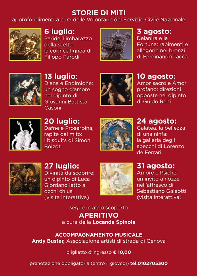 "Arte, musica e vino. ESTATE MITICA a Palazzo Spinola" il nuovo programma dei venerdì estivi alla Galleria Nazionale di Palazzo Spinola.Ogni venerdì sera, in continuità con il suo consueto orario fino alle ore 22.30 (ultimo ingresso alle ore 22), con un ricco programma di eventi e proposte, consultabile sul sito.A partire da venerdì 6 luglio alle ore 18:00 è in programma "Storie di miti",  percorsi di approfondimento su opere a soggetto mitologico custodite a palazzo con accompagnamento musicale di Andy Buster (Associazione artisti di strada di Genova). A seguire aperitivo nell'atrio scoperto, a cura di Locanda Spinola.A cura delle volontarie del Servizio Civile Nazionale. Biglietto di ingresso: €10Prenotazione obbligatoria (entro  il giovedì)Per ulteriori informazioni: 0102705300Vi ricordiamo che il museo, come ogni venerdì d'estate, chiuderà alle 22:30.