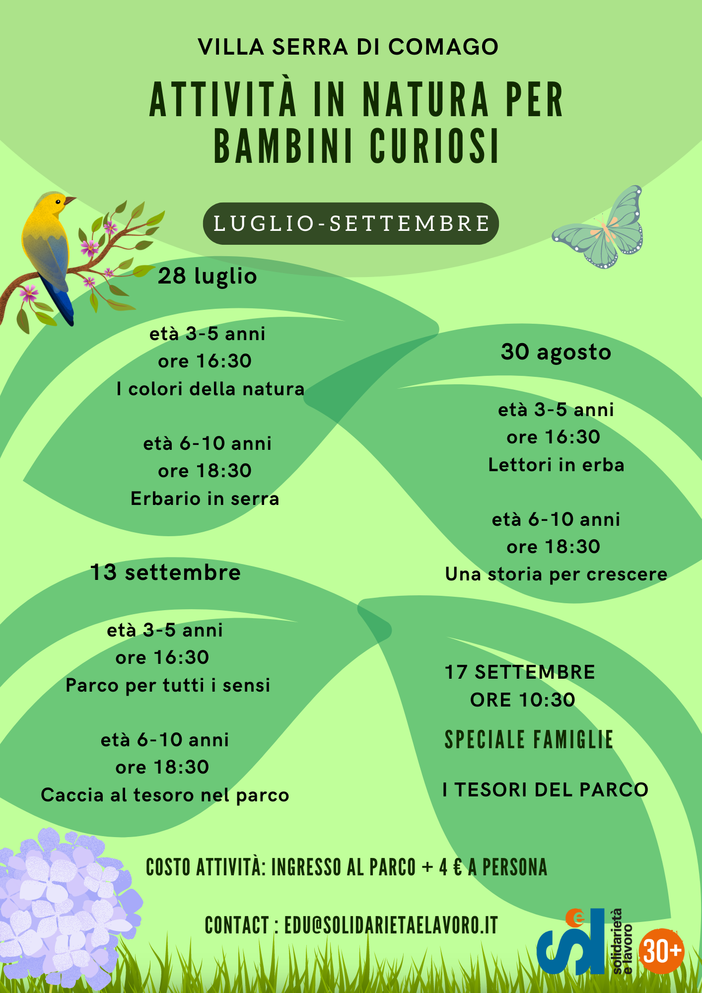 Da giovedì 28 luglio iniziano le attività per bambini proposte dai Servizi Educativi di Solidarietà e Lavoro nel meraviglioso parco di Villa Serra di Comago. Tanti diversi tipi di iniziative per bambini dai 3 ai 5 anni e dai 6 ai 10 anni con 4 appuntamenti tutti da scoprire.