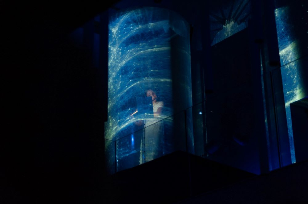 "Al centro della scena un tubo proiettivo nel quale è “imprigionata” la performer (la flautista Laura Faoro): in un poetico mix di video arte, sound processing e Performance Art, l’acqua, il suono, i colori, le immagini e la stessa performer danno vita a un incantesimo post-moderno, nel tubo e nello spazio, sollecitando l’immaginazione e la partecipazione dello spettatore su più piani sensoriali".