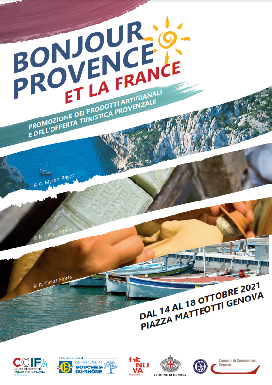 Da giovedì 14 a lunedì 18 ottobre 2021, in Piazza Matteotti a Genova, torna l'appuntamento con Bonjour Provence et la France, una manifestazione promossa dalla Camera di Commercio Italiana per la città di Marsiglia e dal Dipartimento delle Bouches-du-Rhône (area della Provenza francese).