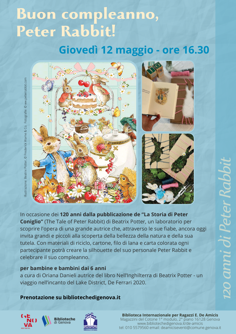 In occasione dei 120 anni dalla pubblicazione de “La Storia di Peter Coniglio” (The Tale of Peter Rabbit) di Beatrix Potter, un laboratorio per scoprire l'opera di una grande autrice che, attraverso le sue fiabe, ancora oggi invita grandi e piccoli alla scoperta della bellezza della natura e della sua tutela. Con materiali di riciclo, cartone, filo di lana e carta colorata ogni partecipante potrà creare la silhouette del suo personale Peter Rabbit e celebrare il suo compleanno.