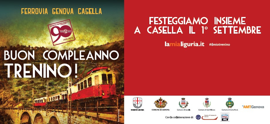 Domenica 1 settembre 2019 la Ferrovia Genova-Casella compie 90 anni e per celebrare il mitico "trenino" che - da quasi un secolo - porta genovesi e turisti alla scoperta dell'entroterra, è stata organizzata una grande festa, tra musica, allegria e prodotti tipici. Una giornata storica che si svolgerà a Casella e a cui possono partecipare tutti, grandi e piccini.