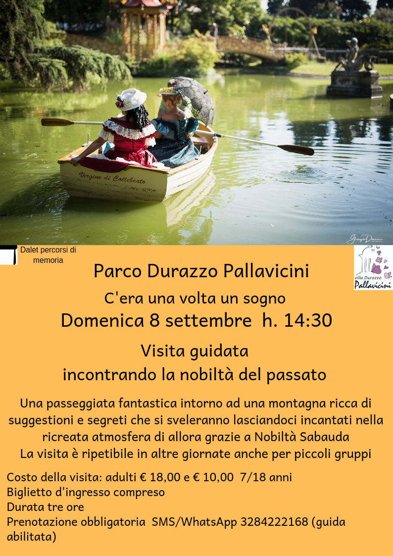 Domenica 8 settembre 2019 alle ore 14:30 al Parco Durazzo Pallavicini di Genova Pegli si tiene la visita guidata dal titolo C'era una volta un sogno, una passeggiata fantastica intorno a una montagna ricca di suggestioni e segreti che si sveleranno lasciandovi incantati nella ricreata atmosfera di allora grazie a Nobiltà Sabauda.