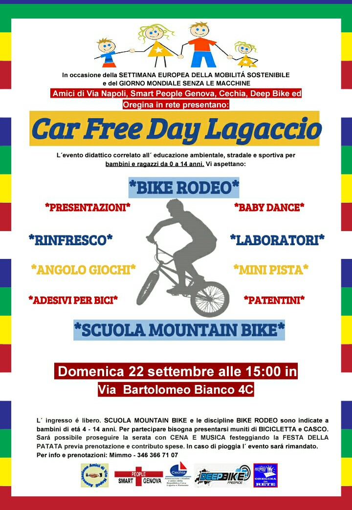 In occasione della Settimana Europea della Mobilità. domenica 22 settembre 2019 si svolge il Car Free Day Lagaccio. L'evento inizia alle ore 15:00 presso sede di Amici di Via Napoli in Via Bartolomeo Bianco. Dedicato all'educazione ambientale, stradale e sportiva per bambini e ragazzi da 0 a 14 anni. Sono previsti anche laboratori, musica e un rinfresco per i partecipanti.