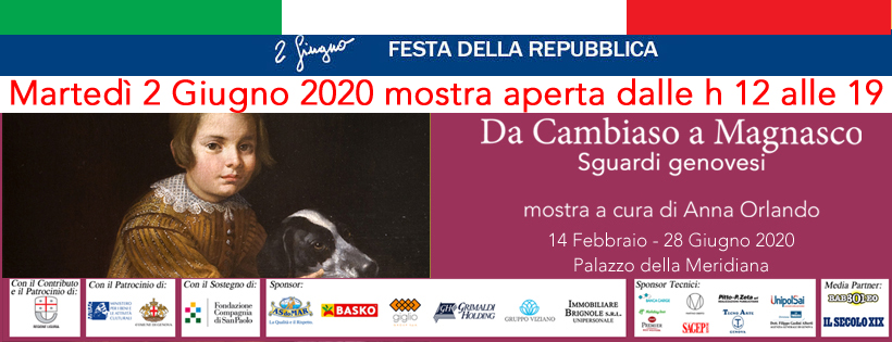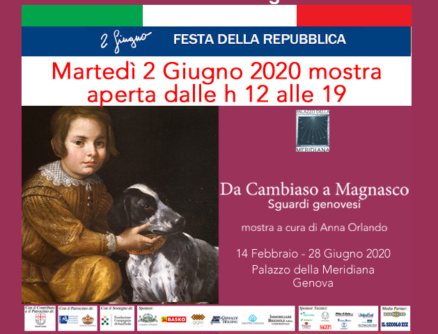 Martedì 2 Giugno, in occasione della Festa della Repubblica, la Mostra "Da Cambiaso a Magnasco - Sguardi genovesi" sarà aperta al pubblico dalle ore 12:00 alle ore 19:00, presso il Palazzo della Meridiana. La mostra, curata da Anna Orlando, storica dell'arte genovese, sarà invece chiusa Lunedì 1 Giugno e Mercoledì 3 Giugno, riprendendo l'apertura dal Giovedì alla Domenica dalle 12:00 alle 19:00.