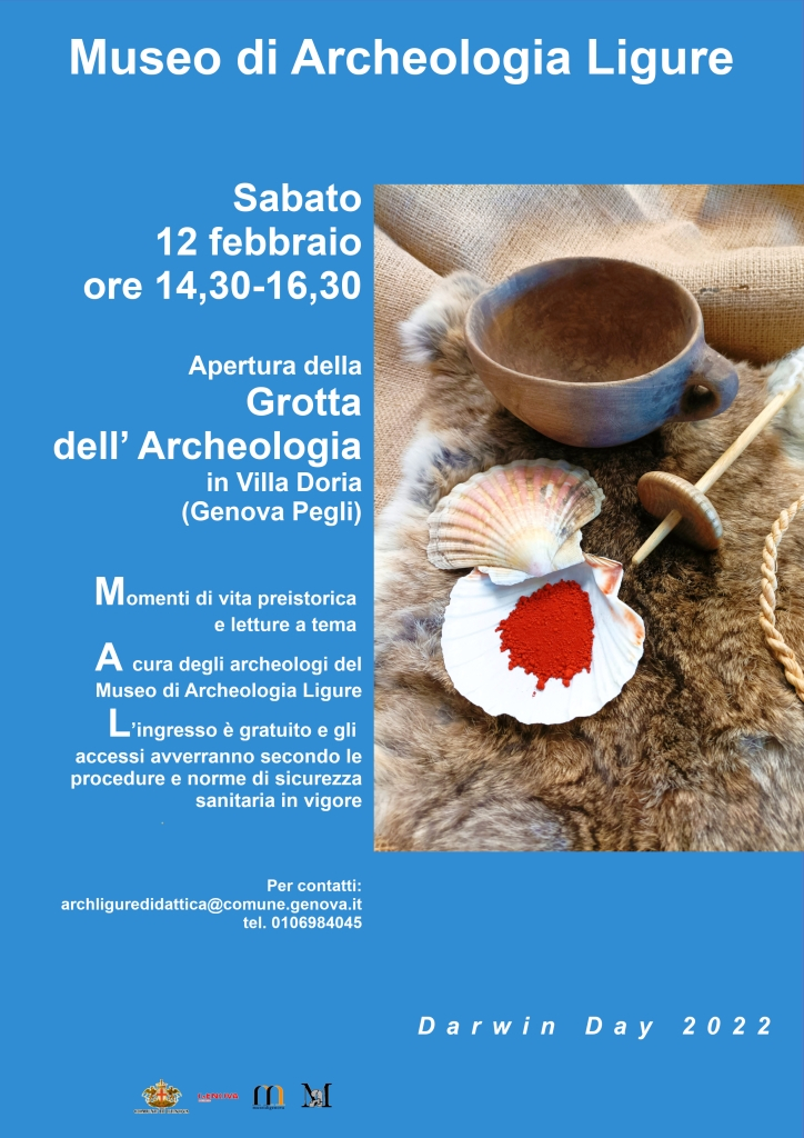 Il Museo di Archeologia Ligure festeggia il Darwin Day 2022 con l'apertura della Grotta dell'Archeologia nel parco di Villa Doria a Pegli. Verrano fatte letture a tema su Darwin e sulle origini dell'uomo oltre a mostrare i manufatti, le materie prime e le tecniche per vivere in prima persona momenti di vita preistorica.