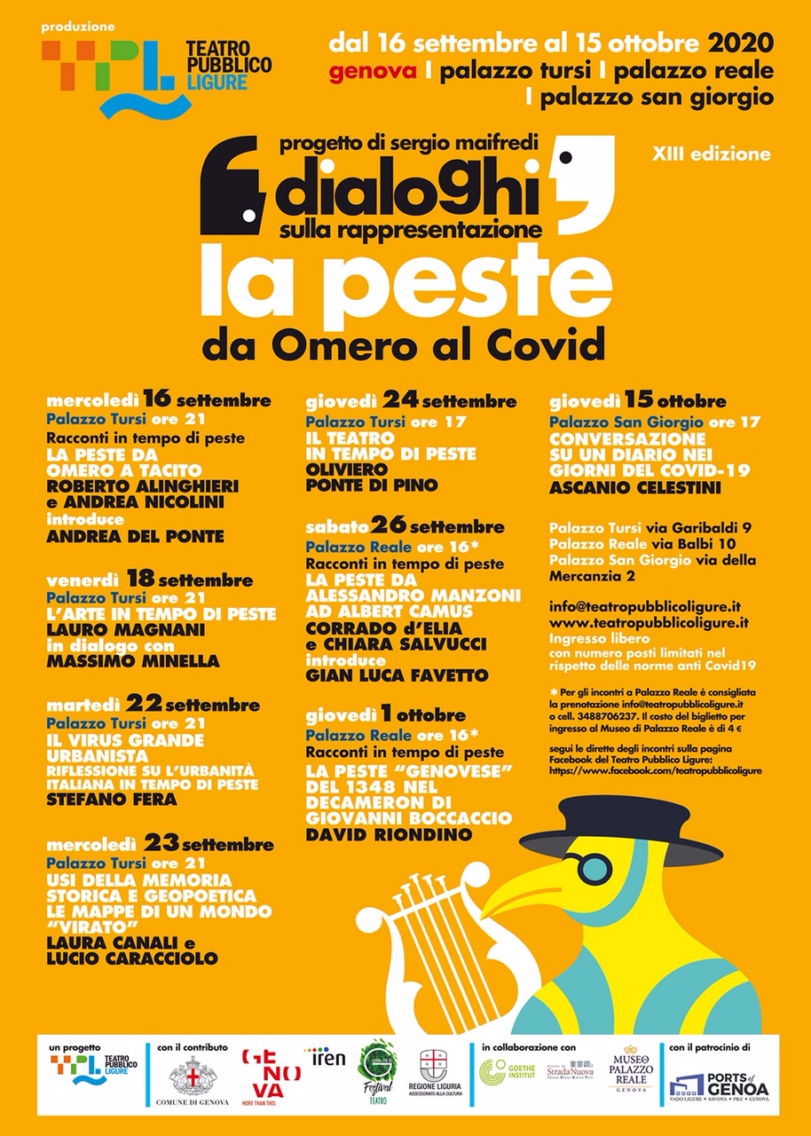 La XIII edizione dei “Dialoghi sulla rappresentazione” ha per titolo La peste, da Omero al Covid. Il progetto di Teatro Pubblico Ligure, ideato e diretto da Sergio Maifredi con il sostegno di Comune di Genova e Regione Liguria, si compone di otto appuntamenti in programma da mercoledì 16 settembre a giovedì 15 ottobre 2020 a Genova, in diverse sedi della città: Palazzo Tursi, Palazzo Reale e Palazzo San Giorgio.