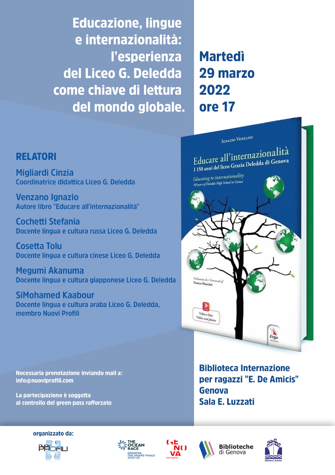 si dialogherà con il professor Ignazio Venzano, autore di "Educare all'internazionalità" edito da Erga Edizioni. Il libro ripercorre i 150 anni di storia del Liceo Linguistico Deledda, lanciando riflessioni e interrogativi sul ruolo delle scuole a vocazione internazionale nella nostra città. Il confronto sarà focalizzato su approcci e sistemi educativi adeguati alle sfide globali, ponendo particolare attenzione all’insegnamento di lingue e culture per preparare i giovani a vivere ed affrontare il mondo. L’esperienza del liceo Deledda, unica nel suo genere a livello nazionale, rappresenta un’innovazione che va colta e valorizzata perché nell’insegnare molti lingue, promuove una lettura realmente interculturale del mondo e degli eventi che lo connotano.