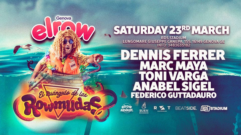 Elrow approda a Genova con il concerto El triángulo de las Rowm. Tutto ha inizio con una festa su una nave pirata. Da qualche parte tra Atlantide ed Es Vedrá, tuttavia, la nave perde la rotta ed entra nelle acque più selvagge dell'isola bianca: il Triangolo Rowmuda. La musica e il rumore della folla svegliano e fanno infuriare il Craken, l'animale più pericoloso di tutto l'Oceano. Questa selvaggia creatura sottomarina ha ingoiato la barca dei pirati con un sol morso, lasciando i partecipanti alla festa in un surreale viaggio nel profondo del Craken. Un mix folle di The Island, Lost and Alive; una festa selvaggia piena di naufragi, aerei precipitati, folli creature del mare e comunità hippy sotto il mare.
