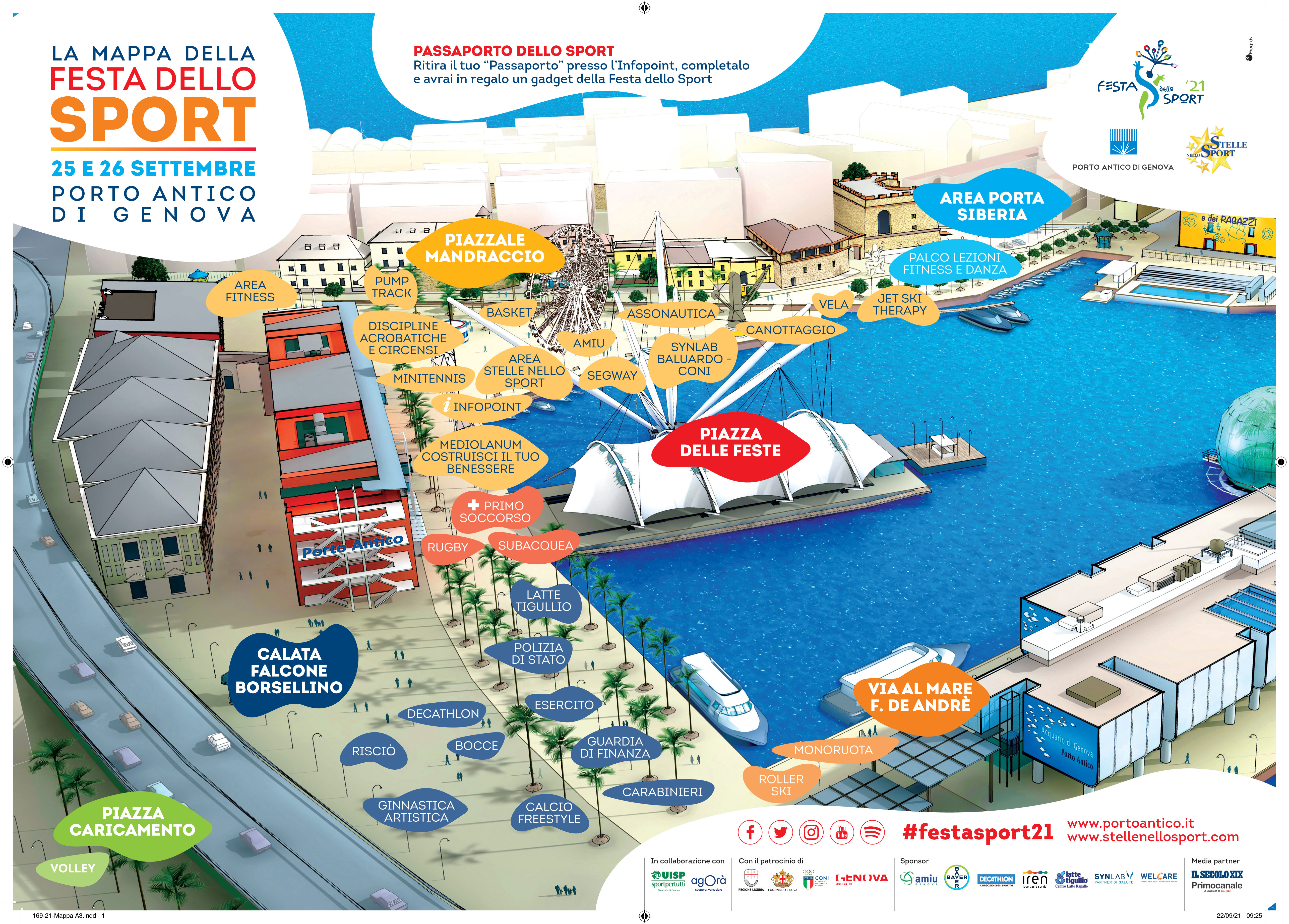 Il Porto Antico diventa un grande villaggio olimpico, da Piazza Caricamento fino all’area di Porta Siberia, attraverso Via al Mare Fabrizio De André, Calata Falcone Borsellino e Piazzale Mandraccio. Gli sport individuali si affiancano a quelli di squadra, e tutte le 60 attività sono come sempre presentate da atleti e professionisti e messe a disposizione di tutti gratuitamente. L’obiettivo è cimentarsi con il maggior numero di discipline possibile. La giornata inizia alle ore 10 con il ritiro all’Infopoint ufficiale (piazzale Mandraccio) della Festa del Passaporto dello Sport, lo strumento necessario a bambini e ragazzi per conquistare i gadget ufficiali della Festa dello Sport, mentre i più grandi potranno dedicarsi alle lezioni di fitness nell’area di Porta Siberia, con le migliori palestre genovesi.