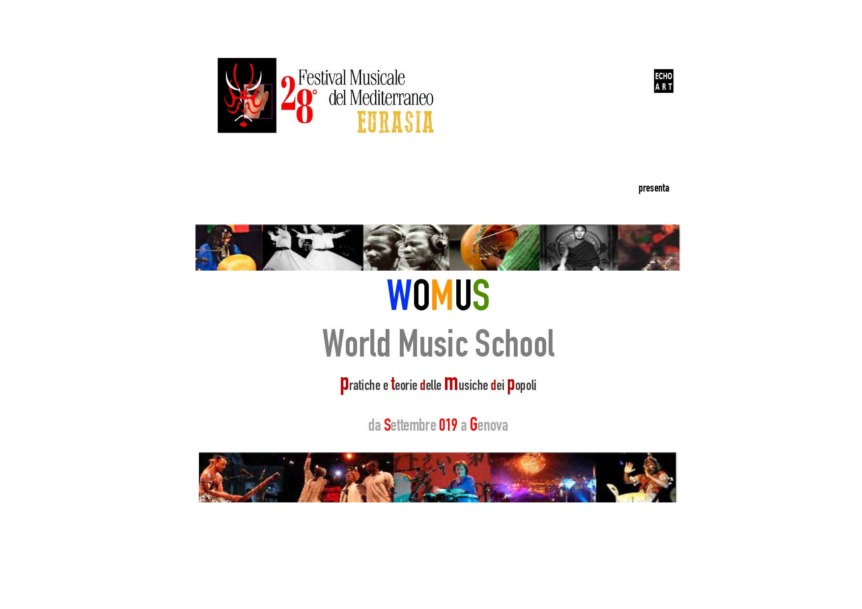 Altro punto d’orgoglio, oltre alla fitta rete di incontri, è la serie di workshop (per cui sono aperte le iscrizioni) intitolata "WOMUS", World Music School, pratiche e teorie delle Musiche dei Popoli, che prevede: