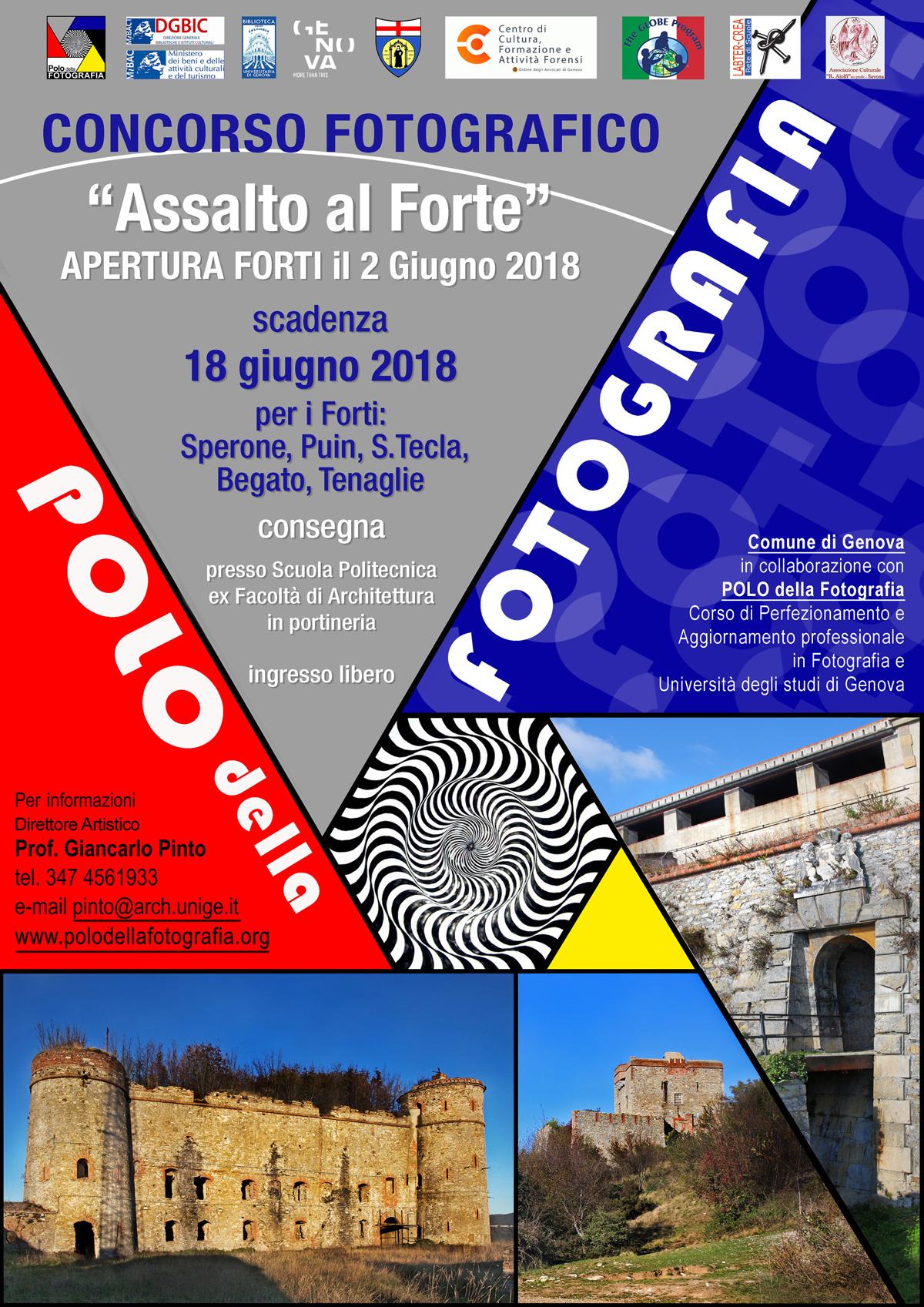 Sabato 2 giugno i forti di Genova spalancano le loro porte al pubblico!Allo scopo di valorizzare il patrimonio dei forti genovesi, è stato organizzato un concorso fotografico titolato "Assalto al forte". Per l'occasione, cinque strutture d'interesse storico e architettonico rimarranno eccezionalmente aperte per la giornata di sabato 2 giugno.I forti in questione sono:Forte S. Tecla: aperto dalle 10.00 alle 18.00Forte Puin: aperto dalle 14.00 alle 18.00Forte Sperone: aperto dalle 10.00 alle 13.00Forte Begato: aperto dalle 10.00 alle 18.00Forte Tenaglia: aperto dalle 10.00 alle 18.00L'ingresso ai forti è gratuito e aperto a tutti, non solo ai fotografi che intendono partecipare alconcorso. L'evento è organizzato dal Comune di Genova in collaborazione con l'Università di Genova, con il Corso di “Perfezionamento e Aggiornamento Professionale in Fotografia” e la Scuola Politecnica di Genova con il Corso di “Fotografia Applicata” Corso di “Metodologie e Rappresentazione del Progetto” e il Polo della Fotografia.