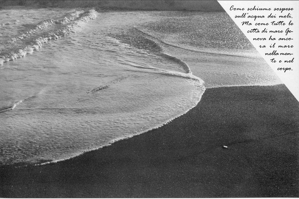 La sua innata capacità di precorrere i tempi le aveva ispirato, quella che oggi è una scelta stilistica molto usata e apprezzata, unire alle “parole iconiche” quelle “verbali”. Nella sua avventura, di racconto su Genova e di Genova, ha coinvolto l’antropologo Prof. Mauro Francesco Minervino. A lui ha chiesto di tracciare un profilo di una sua Genova per metterlo in dialogo con le immagini da lei realizzate. Le considerazioni fatte dall’illustre studioso, hanno generato un contro altare, una cassa di risonanza, un percorso concettuale. Per questo non sono state inserite, attraverso didascalie a latere, ma in spazi ricavati, manualmente, da tagli a vela, direttamente sulle fotografie.