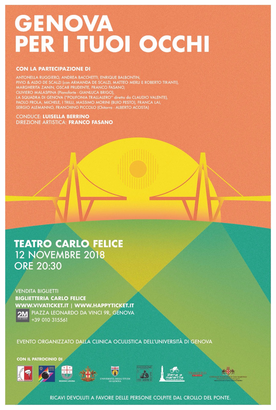 Lunedì 12 novembre, alle ore 20.30, al teatro Carlo Felice un grande evento benefico Genova per i tuoi occhi,  il cui ricavato a favore delle persone colpite dal crollo del Ponte Morandi sul Polcevera.