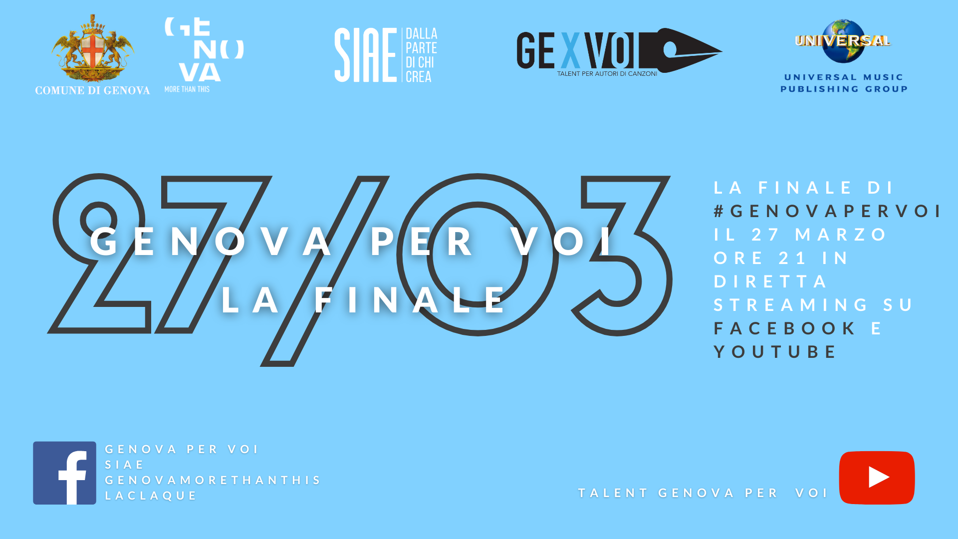 Sabato 27 marzo alle 21, in diretta streaming da La Claque del Teatro della Tosse, si conclude l’ottava edizione di Genova per Voi, il primo talent dedicato agli autori di canzoni.