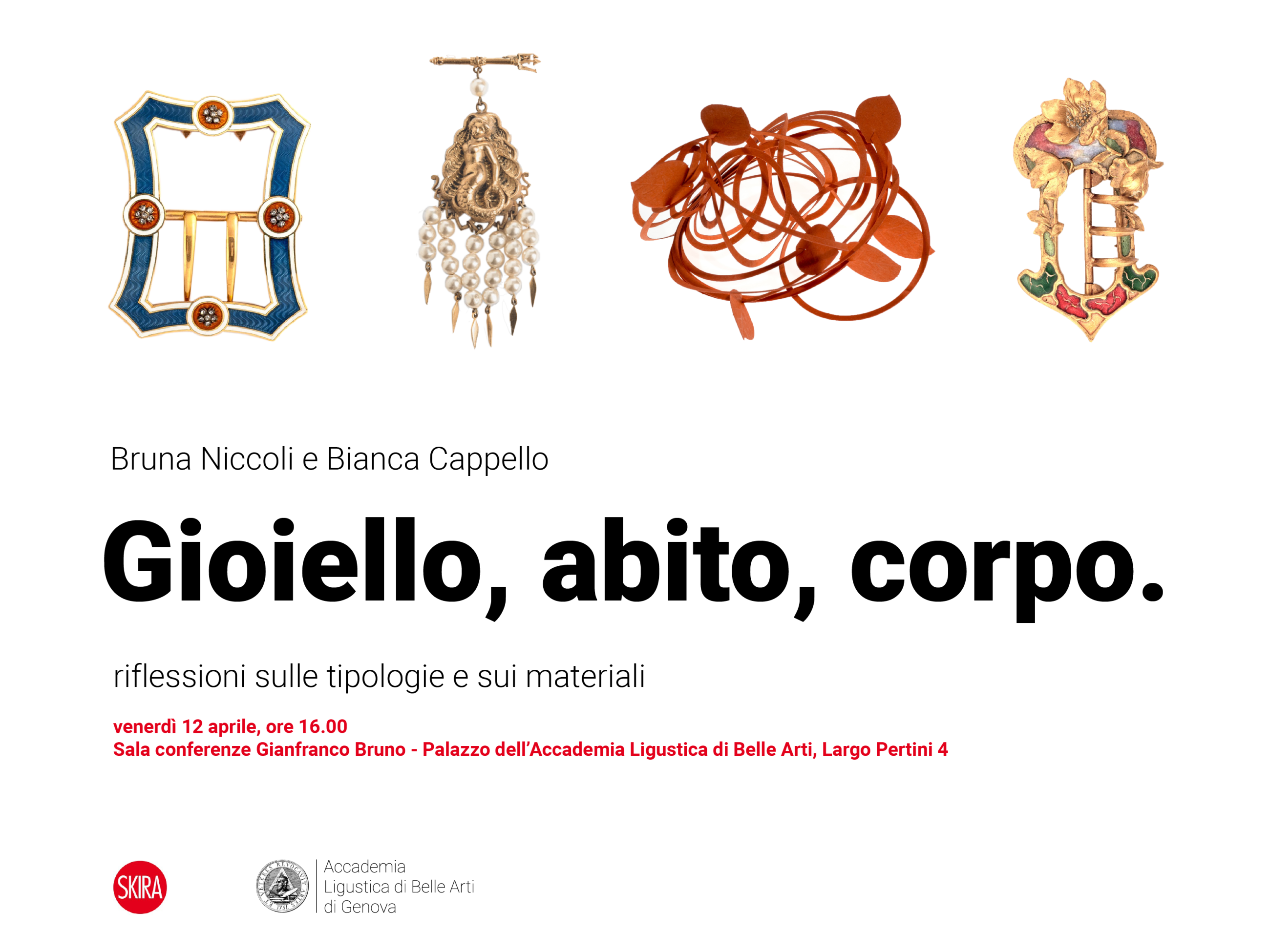 Venerdì 12 aprile, alle ore 16.00, presso la Sala conferenze Gianfranca Bruno dell’Accademia Ligustica di Belle Arti si terrà l'evento Gioello, Abito, Corpo. Saranno presenti Bruna Niccoli e Bianca Cappello, esperte in Storia del costume e del gioiello, per un approfondimento sul rapporto del gioiello con il corpo, con l’abito e con i materiali.