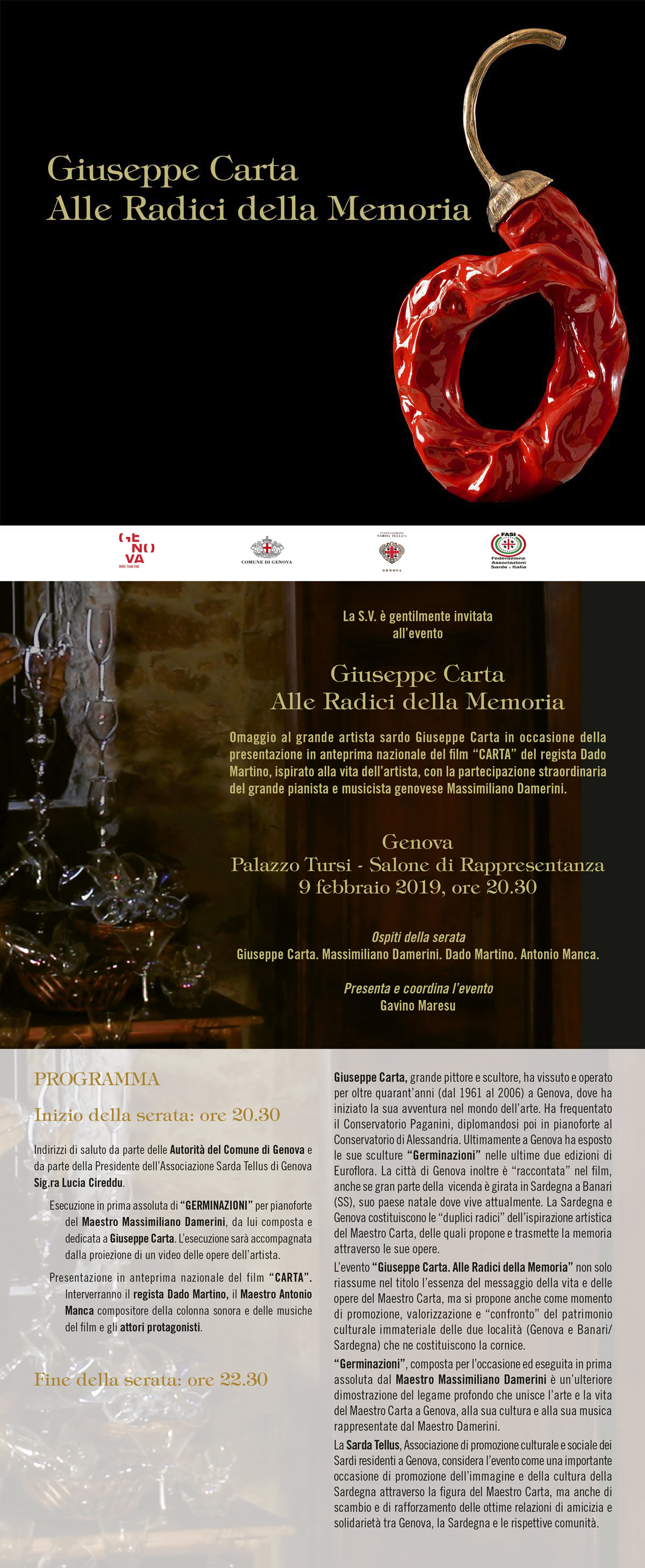 Dopo i saluti da parte delle Autorità del Comune di Genova, promotore e co-organizzatore dell’evento, e della Sig.ra Lucia Cireddu, Presidente della Sarda Tellus, co-organizzatrice e finanziatrice dell’evento, il compositore Massimiliano Damerini si esibirà al pianoforte con l'esecuzione in prima assoluta della fantasia "Germinazioni".