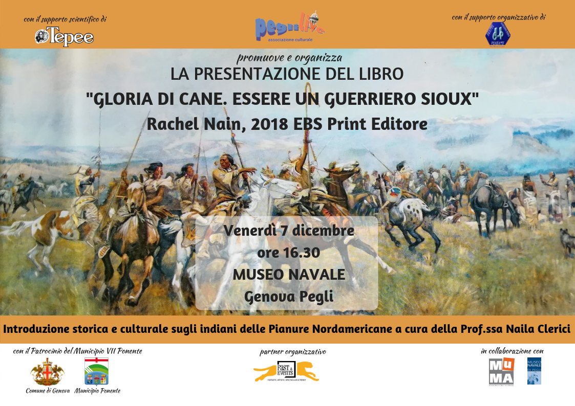 Venerdì 7 dicembre, presso la Sala degli Argonauti del Museo Navale di Genova Pegli, l’Associazione Culturale Pegli Live promuove e organizza, in collaborazione con Mu.MA e CUP, la presentazione del libro Gloria di cane. Essere un guerriero Sioux, di Rachel Nain, 2018 – EBS Print Editore.