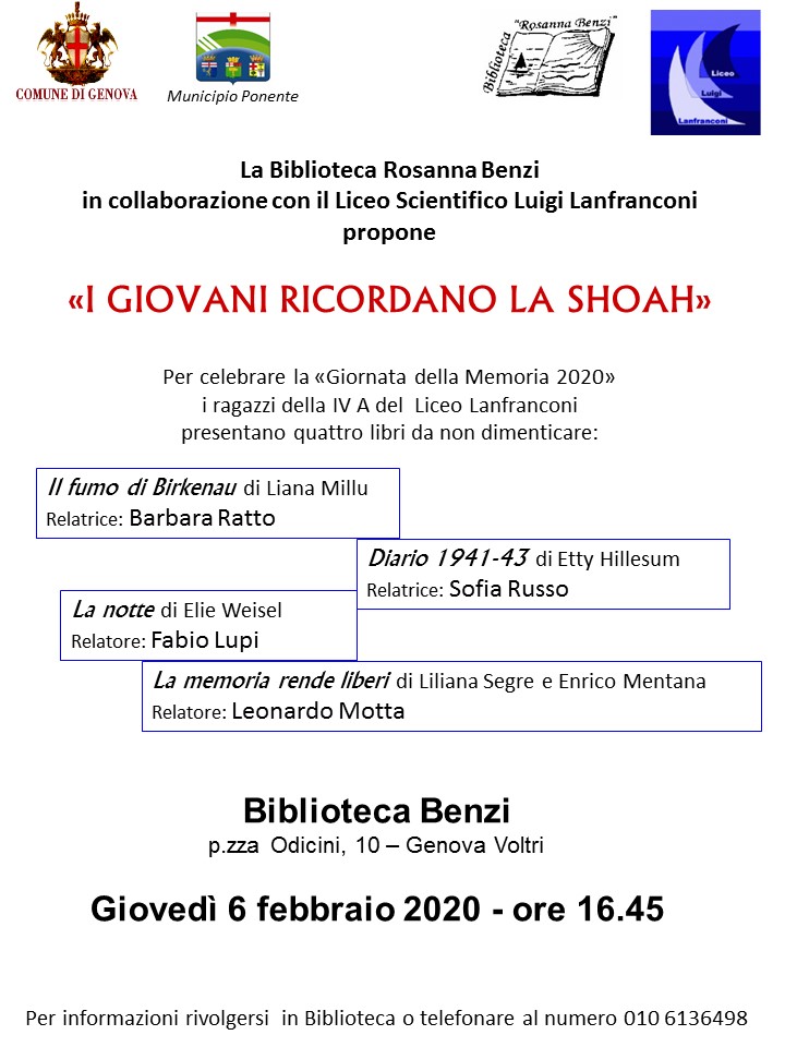 Per celebrare la “Giornata della memoria”, 4 ragazzi della 4°A del Liceo “Lanfranconi” (Barbara Ratto, Sofia Russo, Fabio Lupi e Leonardo Motta) presentano in biblioteca quattro libri da non dimenticare: Il fumo di Birkenau, Diario 1941-43, La notte, La memoria rende liberi.