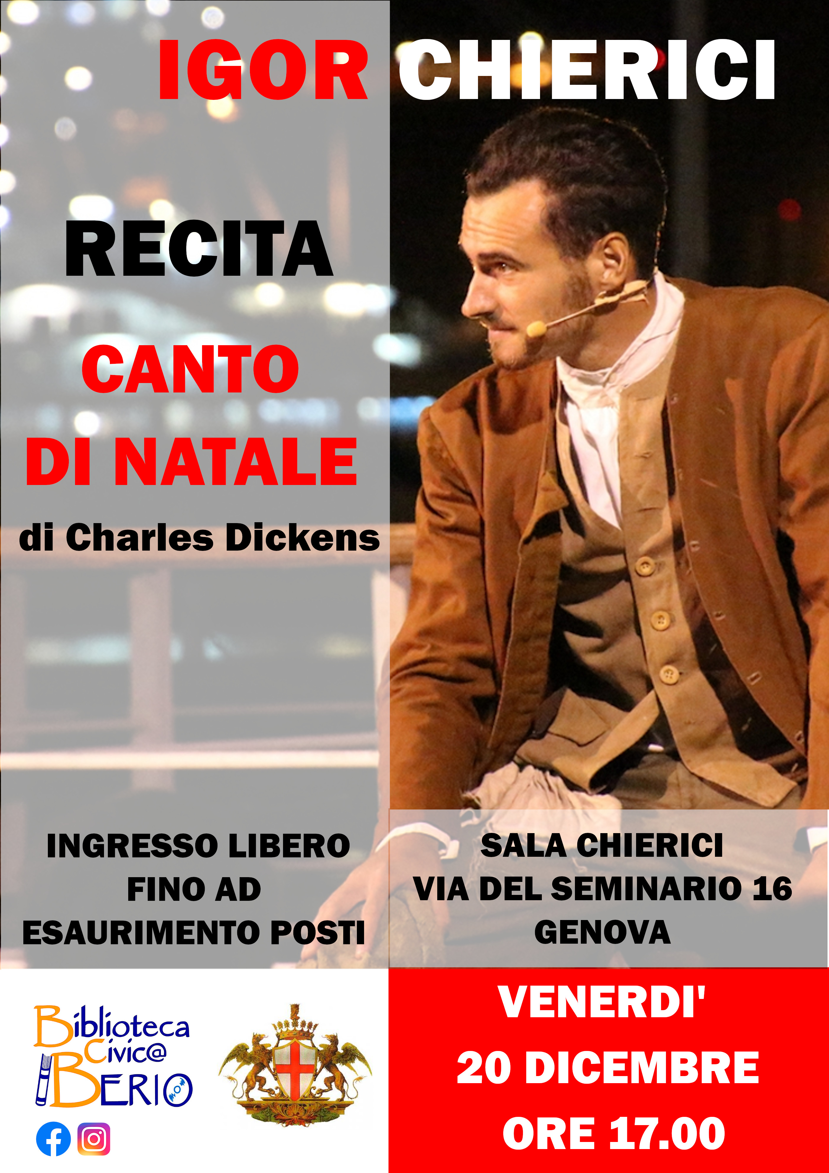 Igor Chierici leggerà e interpreterà il capolavoro di Charles Dickens "Il canto di Natale". Venerdì 20 Dicembre alle ore 17.00 alla Sala Chierici, la magia del Natale prenderà vita. I personaggi del celebre racconto avranno corpo e voce per raccontare al pubblico la storia di Scrooge, protagonista indiscusso del romanzo.