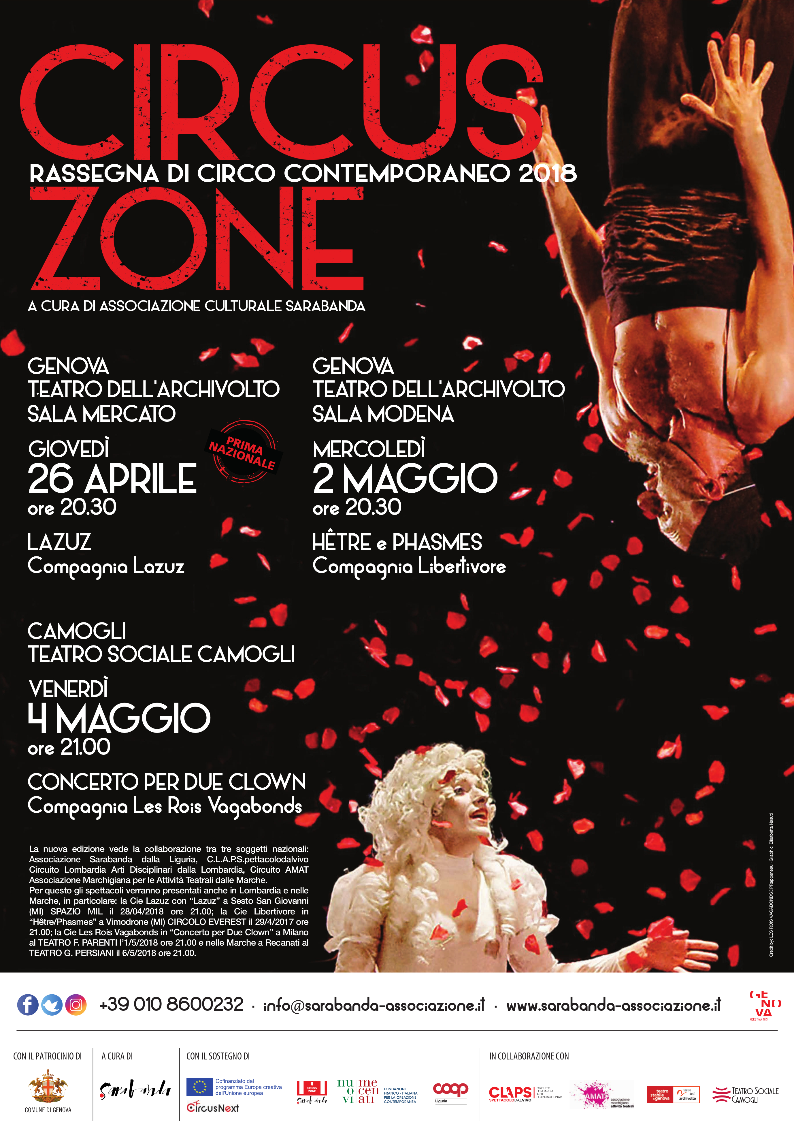 Anche per questa nuova edizione Sarabanda ha deciso di espandere il proprio raggio d’azione e coinvolgere in una rete di enti e realtà altri due soggetti in due regioni differenti per facilitare ancora di più la circuitazione e diffusione di spettacoli europei e internazionali sul territorio. Ma non solo: per il 2019 la collaborazione diventa anche tra Italia e Francia con una rete europea tra Sarabanda e il Festival CIRCA (Fr) nata con il fine di realizzare uno “scambio” culturale tra i due paesi. Come? Portando in Italia 3 compagnie francesi in occasione di CIRCUS ZONE 2019 (vedi programma di seguito) e viceversa portando 3 compagnie italiane al Festival CIRCA 2019, nella città di Auch (Fr). Mai prima d’ora durante il prestigioso evento, punto di riferimento del circo contemporaneo internazionale, sono state presentate compagnie italiane. Un progetto comune nato con l’intento di creare un punto di vista reciproco tra i due paesi coinvolti, Italia e Francia, con uno sguardo alla commistione di linguaggi e contenuti di giovani compagnie man mano coinvolte nei due paesi all’interno dei Festival CIRCA di Auch (Fr) e CIRCUS ZONE di Genova (It), attento agli intrecci narrativi e alla circuitazione come incremento di possibilità di crescita. Grazie a questa rete di collaborazioni, diverse compagnie saranno così programmate in 2 paesi (Francia e Italia) e in Italia su 3 differenti regioni italiane quali la Liguria, la Lombardia e le Marche per un progetto complessivo che prevede quindi la realizzazione di 6 spettacoli in 5 comuni differenti, ovvero: Genova, Chiavari, Camogli, Milano, Ascoli Piceno. Le compagnie 2019 sono: Compagnia Circoncentrique con Réspire, Audrey Decaillon – Compagnia See con Pio Ospedale Della Pietà, Collettivo A sens unique con Mule, Compagnia La Mob à Sisyphe con Huitième jour. Le cirque des enfants terribles. Con il sostegno dell’Institut Français Italia e di Nuovi Mecenati – Fondazione franco-italiana di sostegno alla creazione contemporanea. In collaborazione con il Festival CIRCA di Auch (Fr), e in rete con i circuiti multidisciplinari C.L.A.P. Spettacolodalvivo Circuito Lombardia Arti Pluridisciplinari Spettacolo dal vivo e AMAT Associazione Marchigiana Attività Teatrali. All’interno del progetto Cirkaround sostenuto dal Ministero Italiano del Turismo e della Cultura.