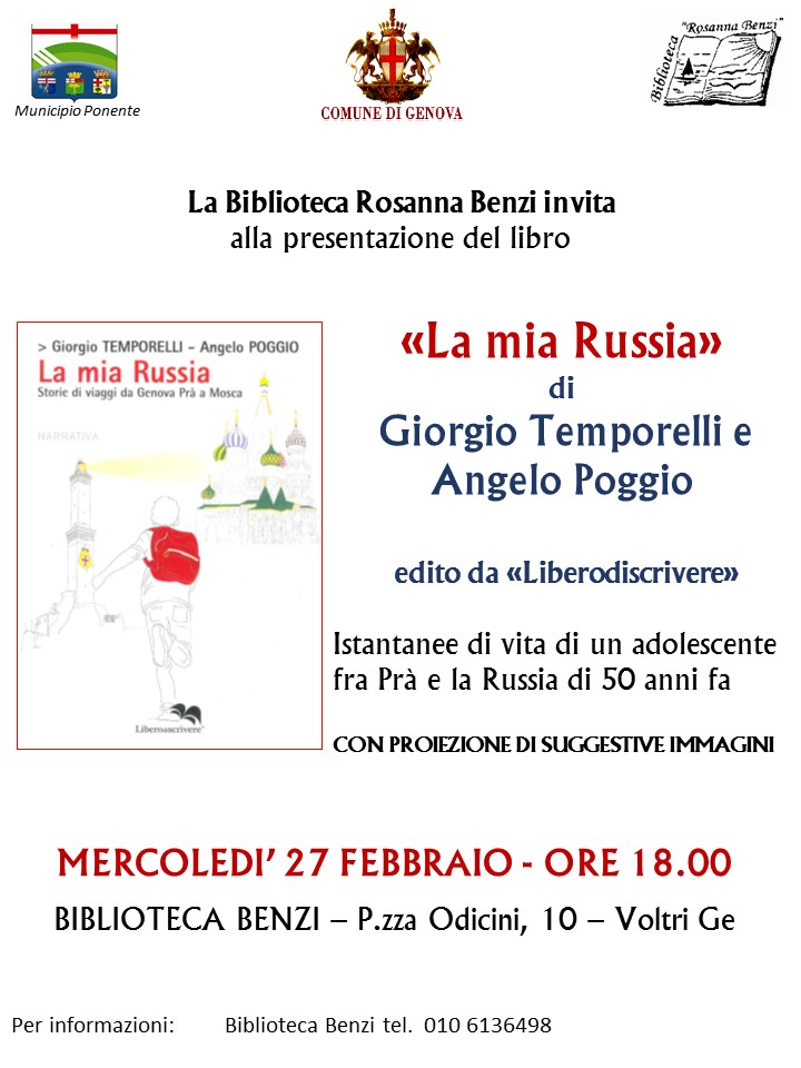 Presentazione del libro “La mia Russia” di Giorgio Temporelli e Angelo Poggio. Edito da Liberodiscrivere. Nel romanzo “La mia Russia” gli autori presentano istantanee di vita vissuta fra Prà e la Russia di 50 anni fa. A corredo della presentazione del libro verranno proiettate suggestive immagini. Per ulteriori informazioni contattare la Biblioteca BENZI – Genova Voltri 16158 Piazza Odicini, 10 Tel. 010 6136498 e-mail: biblbenzi@comune.genova.it