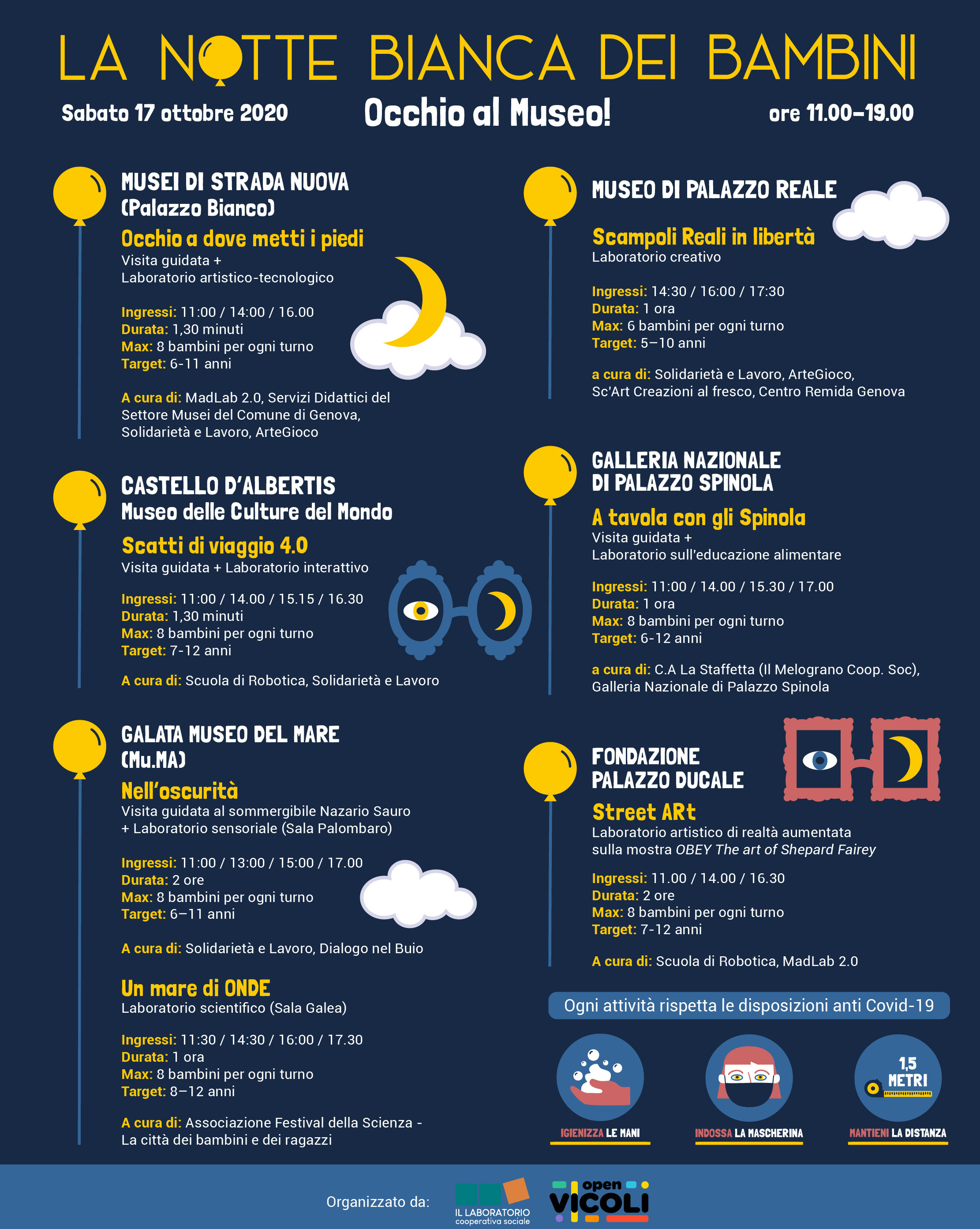 La Rete di Open Vicoli, composta da diversi soggetti pubblici e privati appartenenti a mondi differenti, ha lavorato per offrire una giornata di divertimento, dove i protagonisti rimangono i bambini che avranno la possibilità di compiere un viaggio all’insegna della bellezza, dell’arte e della cultura. “Occhio al Museo!” è il sottotitolo di questa nona edizione e prevede una visita guidata a misura di bambino e, a seguire, un laboratorio creativo in sei Musei di Genova: Palazzo Bianco (Musei di Strada Nuova), Castello D'Albertis Museo delle Culture del Mondo, Galata Museo del Mare (Mu.MA - Istituzione Musei del Mare e delle Migrazioni), Museo di Palazzo Reale, Galleria Nazionale di Palazzo Spinola e Fondazione Palazzo Ducale. Le opere custodite nei Musei, gli arredi, le architetture, le mostre tematiche diventeranno un pretesto per creare divertenti laboratori artistici, tecnologici e scientifici. Un viaggio tra diversi materiali e tecniche con l’obiettivo di stimolare la creatività e la manualità del bambino.