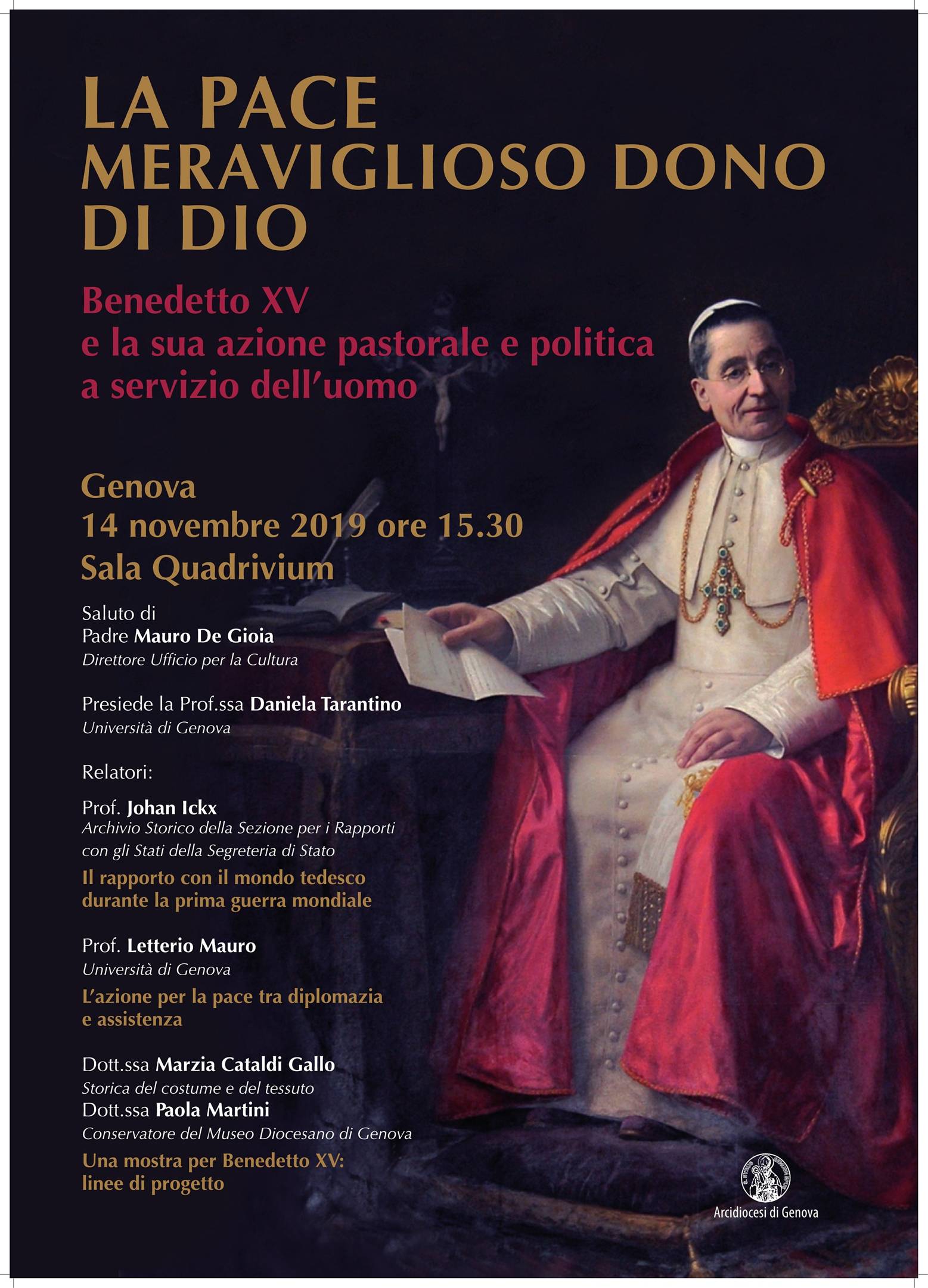 Il 14 novembre, presso la sala Quadrivium alle ore 15:30 si terrà il convegno "La pace meraviglioso dono di Dio": Benedetto XV e la sua azione pastorale e politica a servizio dell'uomo, per ricordare la figura di Benedetto XV, l’ultimo papa nato a Genova.