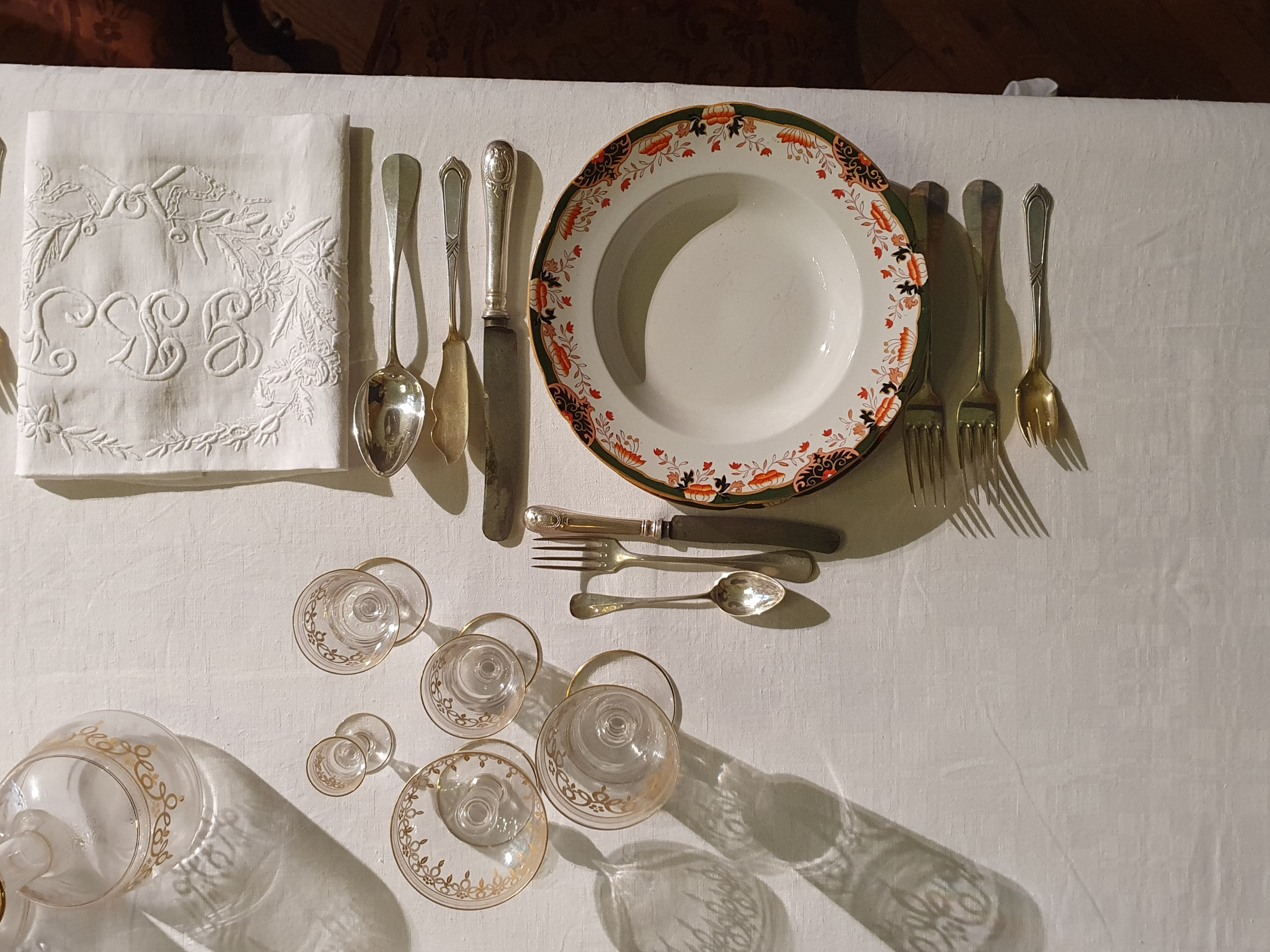 Spunto per lo sviluppo di questi temi saranno il servizio inglese di piatti e da caffè degli sposi Figari marcato “Ashwurth Bros. Hanley Primavesi & sons, Cardiff”, una ditta attiva tra il 1850 e il 1915 con sedi a Cardiff e Swansea, città costiere del Galles; il ricco servizio di bicchieri con decori in oro e il centrotavola in cristallo e bronzo, sempre di Baccarat, la prima manifattura di cristallo di Francia, che vantava commesse prestigiose da parte di nobili e sovrani; l’articolato servizio di posate in argento corrispondente al succedersi delle portate previste dalla ormai affermata apparecchiatura alla russa.