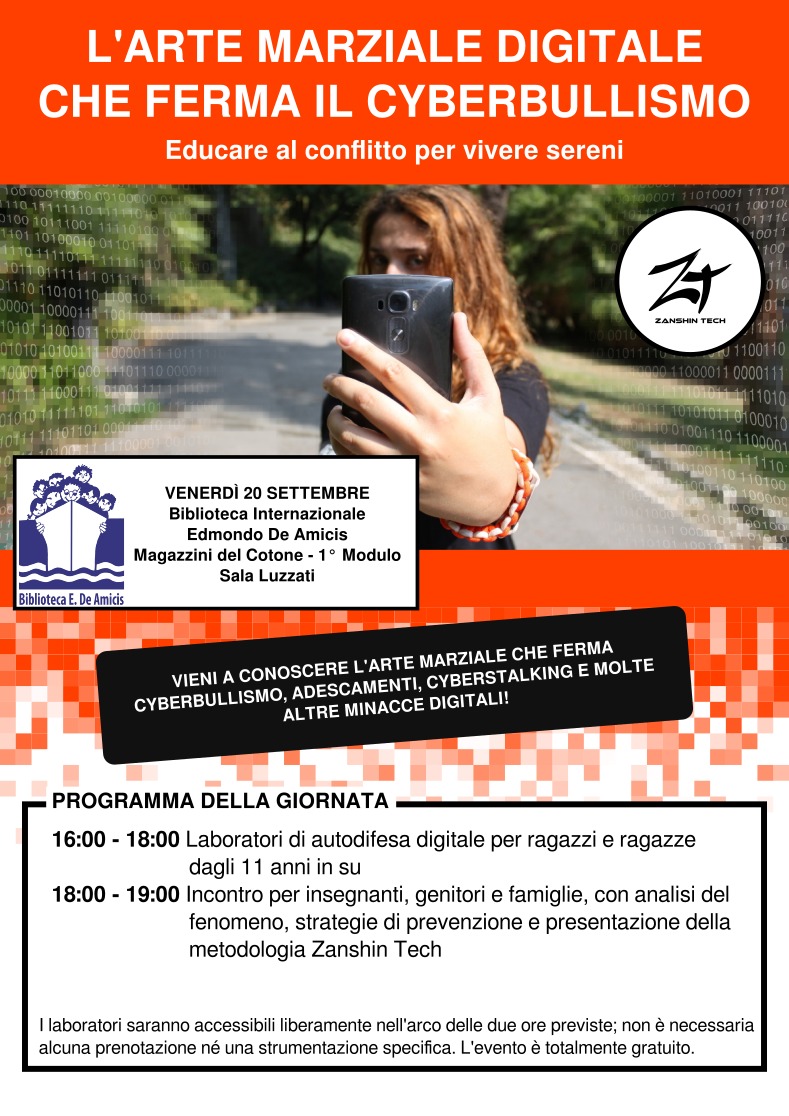 L’obiettivo dei laboratori è quello di insegnare ai giovanissimi le basi della autotutela digitale e mostrare loro come fare per contrastare in autonomia alcune tipologie di attacco molto comuni. I laboratori saranno svolti da personale certificato MIUR come Consulente Mediatore in Cyberbullismo (prima figura professionale in Europa dedicata a questa problematica) con la collaborazione degli allievi dei dojo Zanshin Tech genovesi.