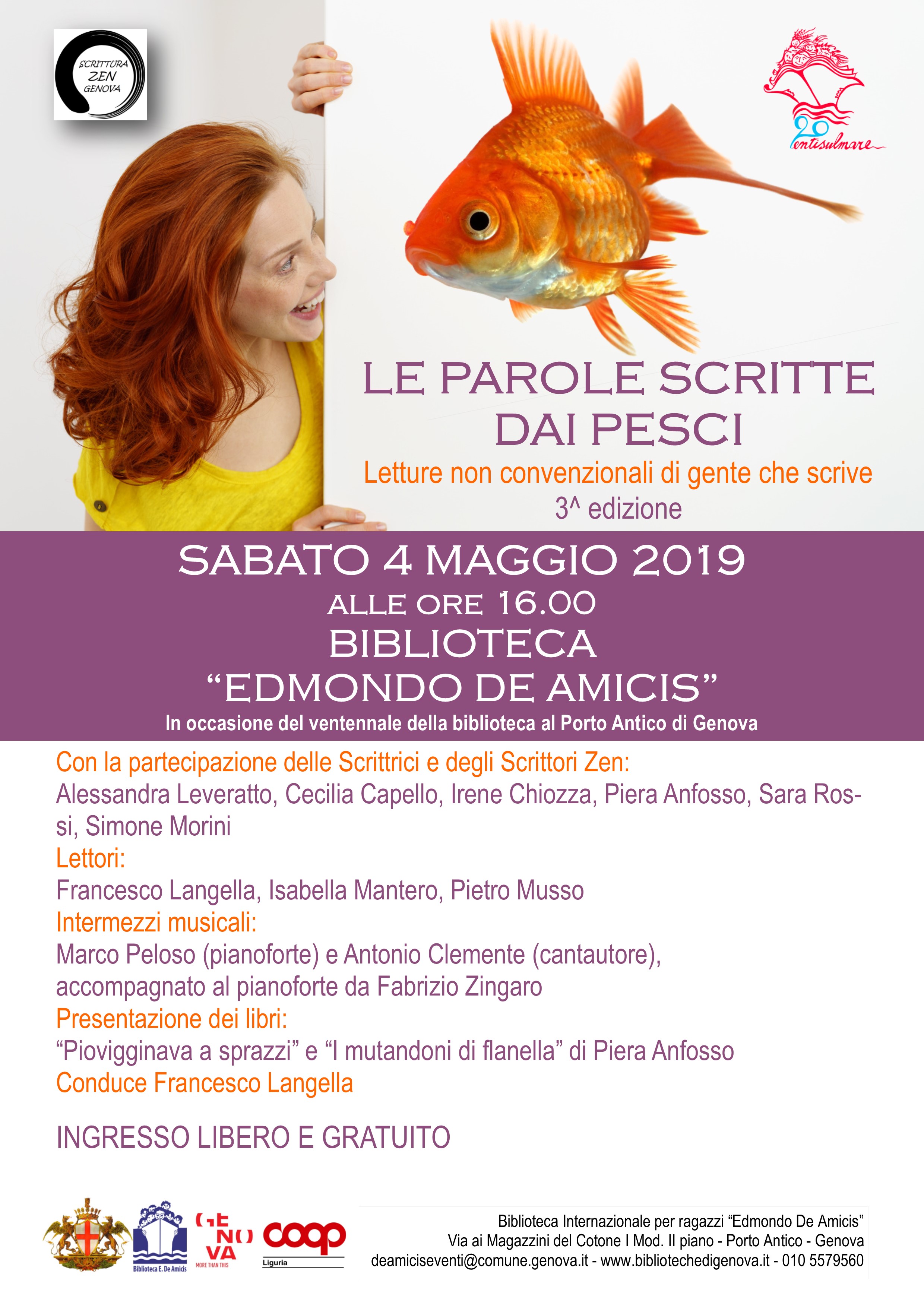 Parafrasando un titolo di Davide Van De Sfroos, Le parole sognate dai pesci, la Biblioteca, in occasione del suo ventennale al Porto Antico, propone la terza edizione della sua divertente, surreale e insolita mini rassegna letteraria.