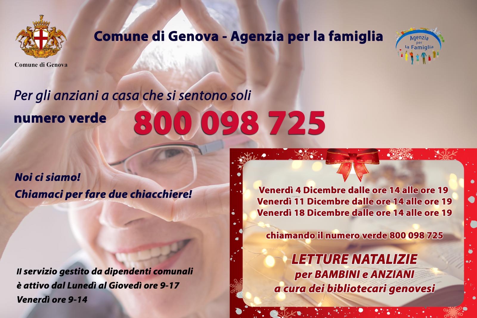 Racconti, fiabe, poesie natalizie e testi della tradizione genovese sono i doni che, nei venerdì precedenti il Natale, l’Agenzia per la Famiglia offrirà in collaborazione con il Sistema Bibliotecario del Comune di Genova attraverso il numero verde 800098725.